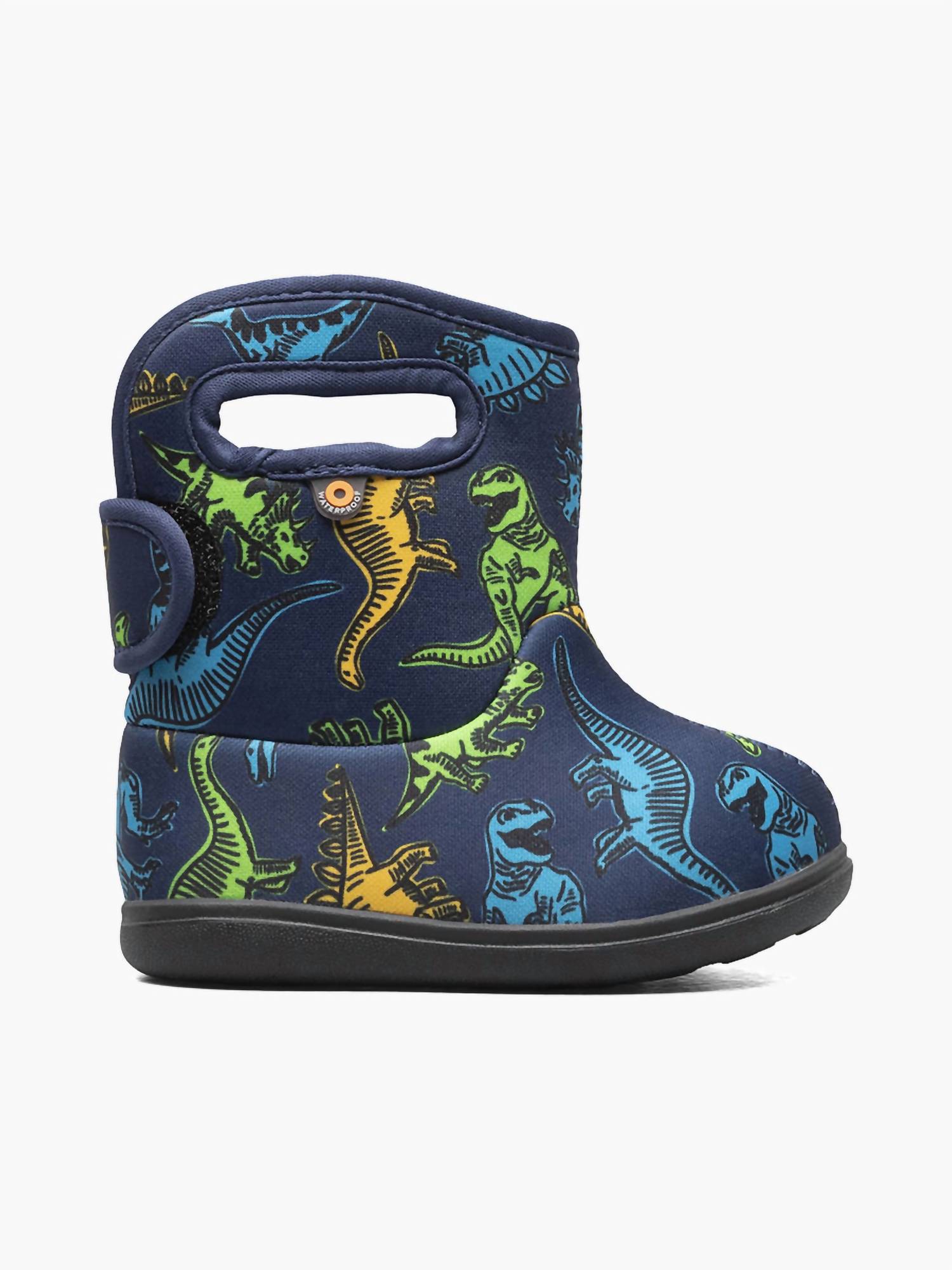 Introducing the Boy’s Dinosaur Boots by BOGS, designed to keep your little one's feet dry and stylish with a playful dinosaur print. These navy boots feature a 100% waterproof construction and Neo-Tech insulation, ensuring comfort and warmth. With a flat heel and a round toe shape, they offer a perfect fit for boys with medium-width feet. Plus, they are machine washable, making them easy to clean and maintain.