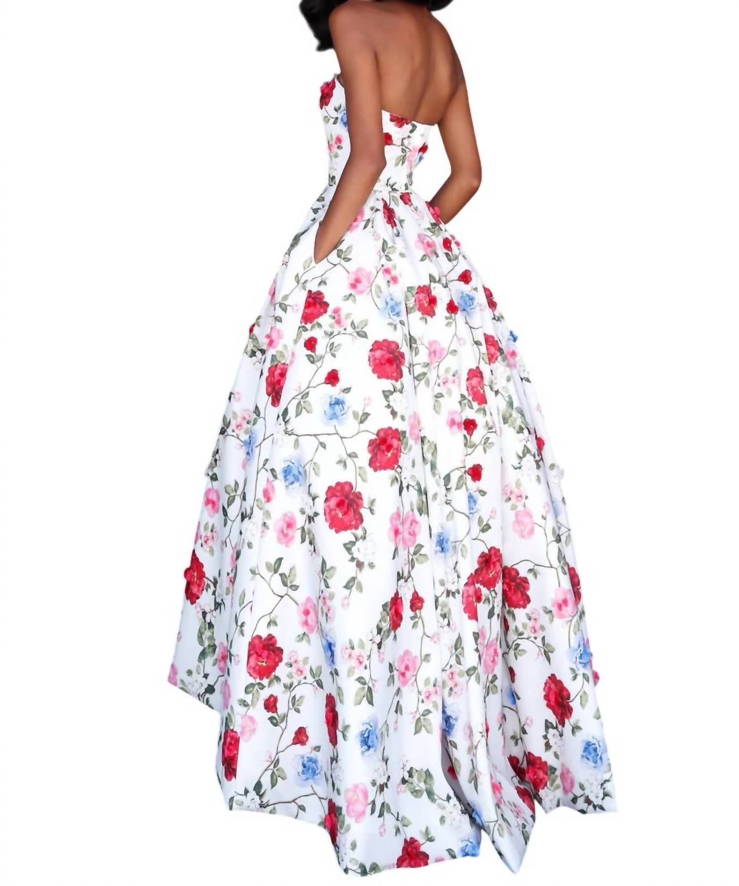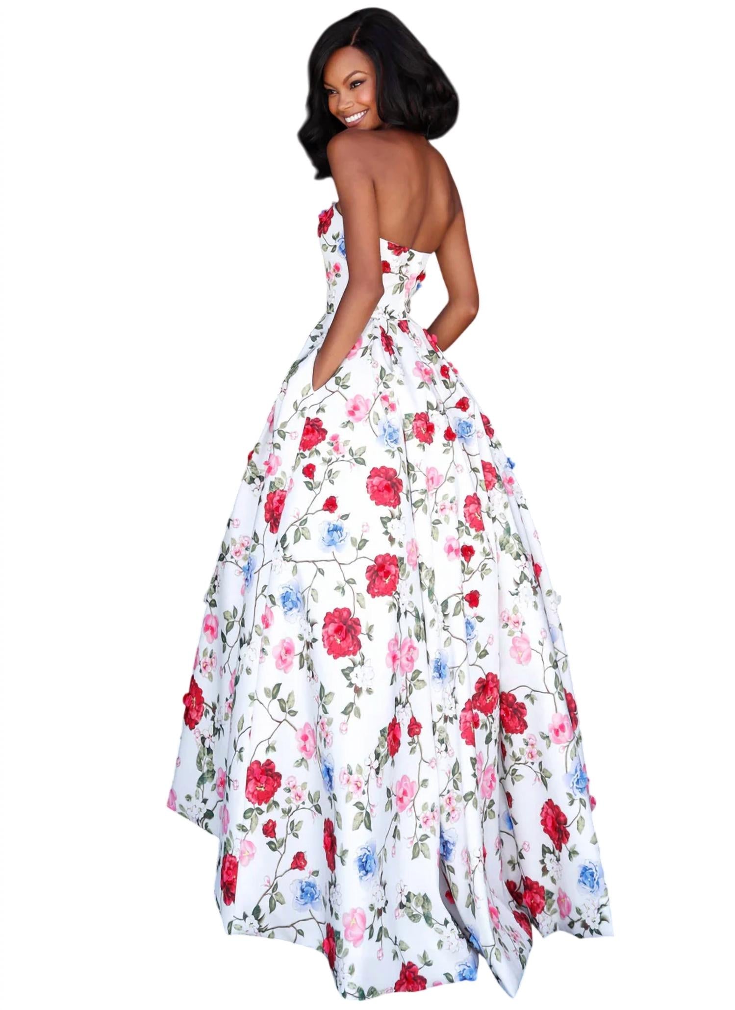 This women's dress features a floral pattern in an ivory print, crafted from luxurious taffeta for a graceful silhouette. Designed with strapless piece offers a sleek, pocket-adorned look for added convenience. SKU: 51795