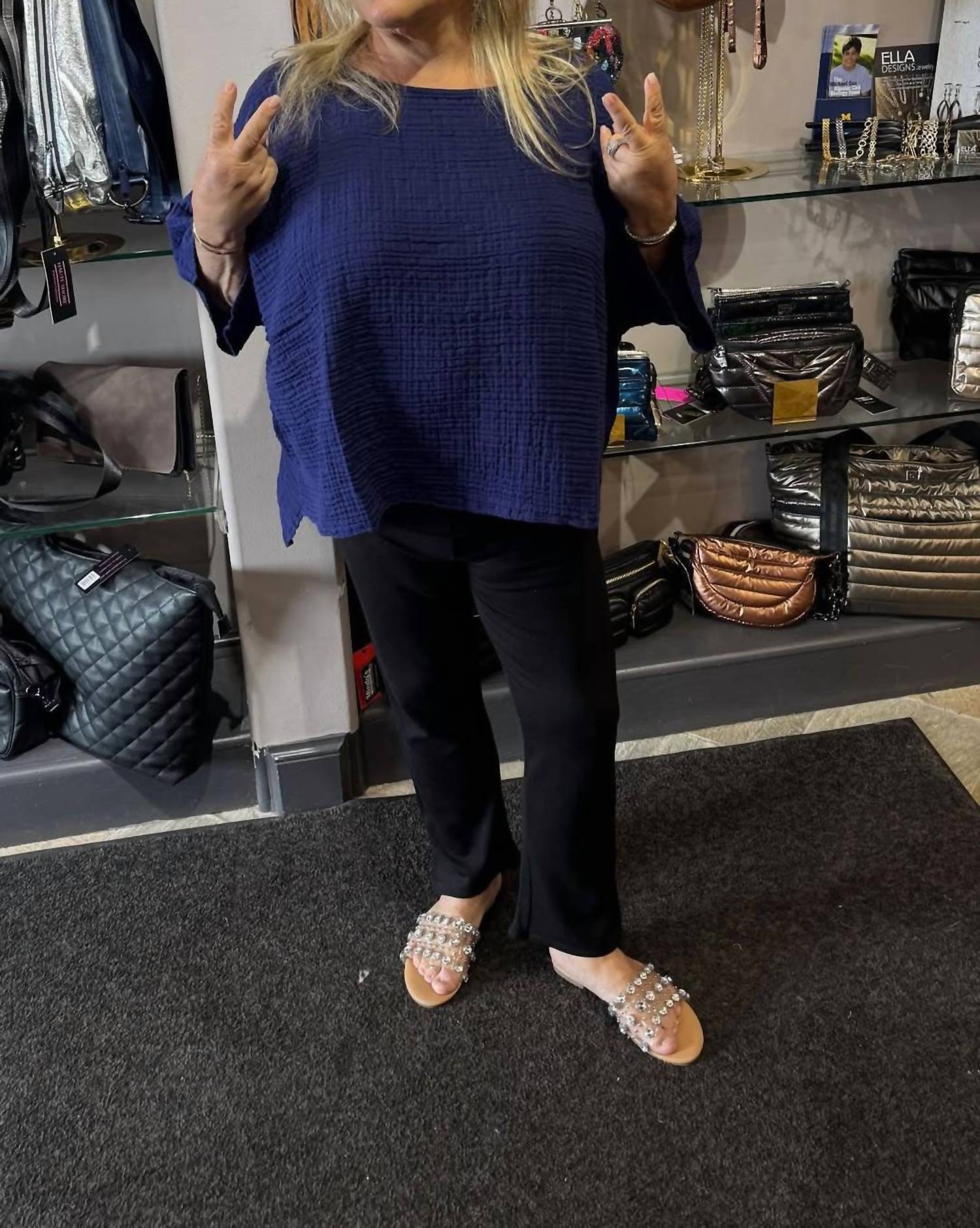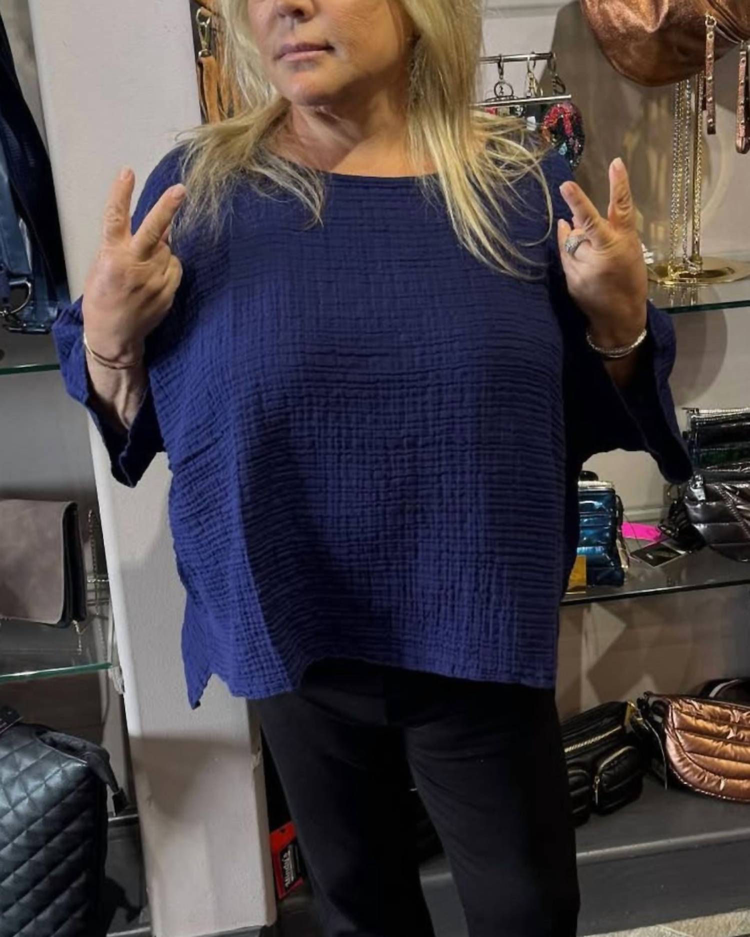 A versatile blouse that works from desk to dinner! Elevate your style with the Alina One Size Top by KOZAN, a masterpiece in a solid River hue perfect for any monochrome wardrobe. This women's blouse features a scoopneck and short sleeves, offering a relaxed yet polished look suitable for various occasions like spring engagements or Thanksgiving gatherings. With a convenient pull-on closure, this top is designed for ease and style. Originating from KOZAN’s trendy collection, it fits effortlessly into your seasonal fashion lineup.