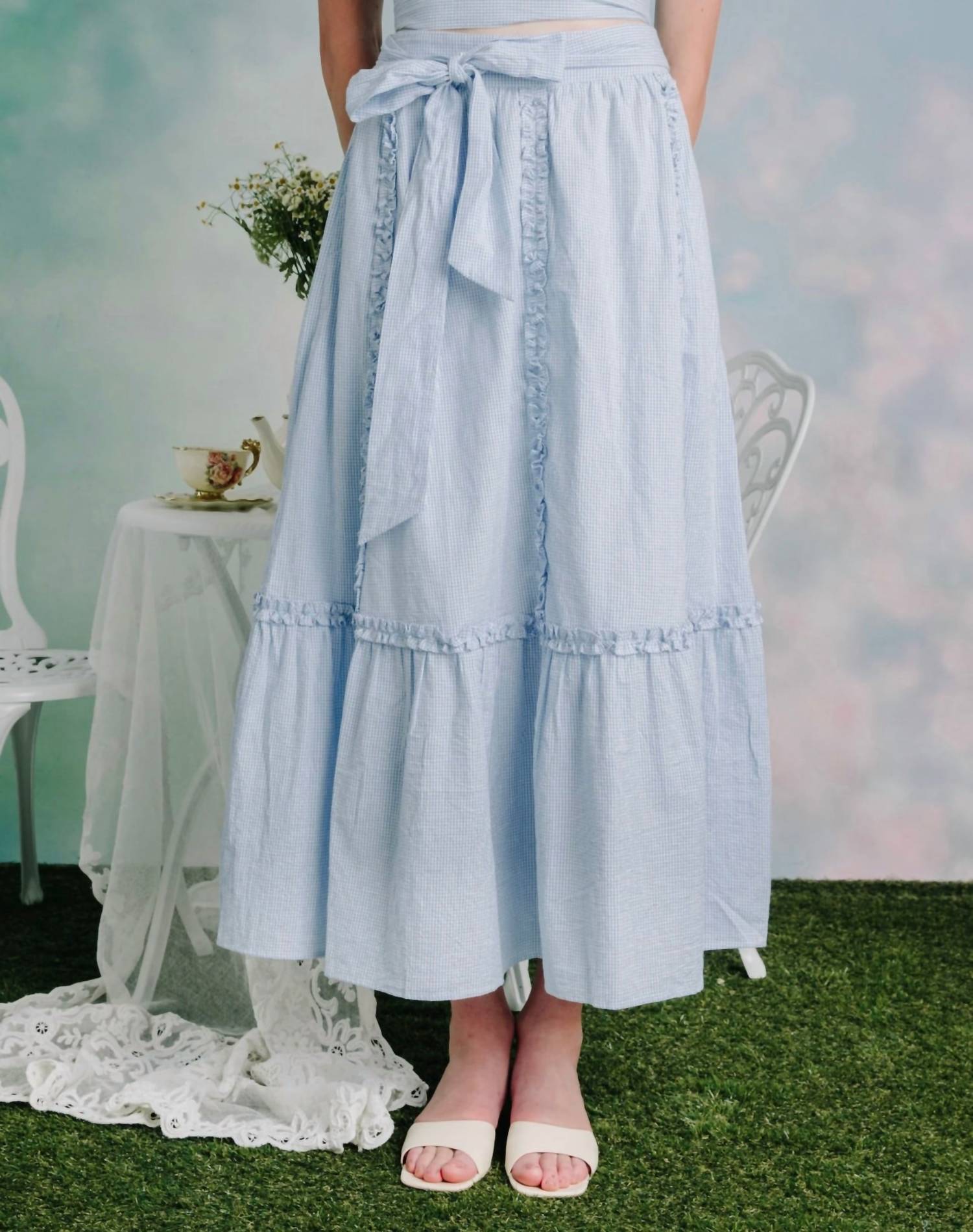 Who doesn't love a good maxi skirt? Introducing the Elowen Maxi Skirt by LOVE THE LABEL, a women's boho chic essential for summer sophistication. This skirt features a maxi length in a charming blue and white seersucker check, complete with intricately gathered ruffles and a self-tie belt. Constructed from 100% cotton, its pull-on styling enhances comfort, while two side pockets provide practicality. Care is easy—simply machine wash and lay flat to dry.