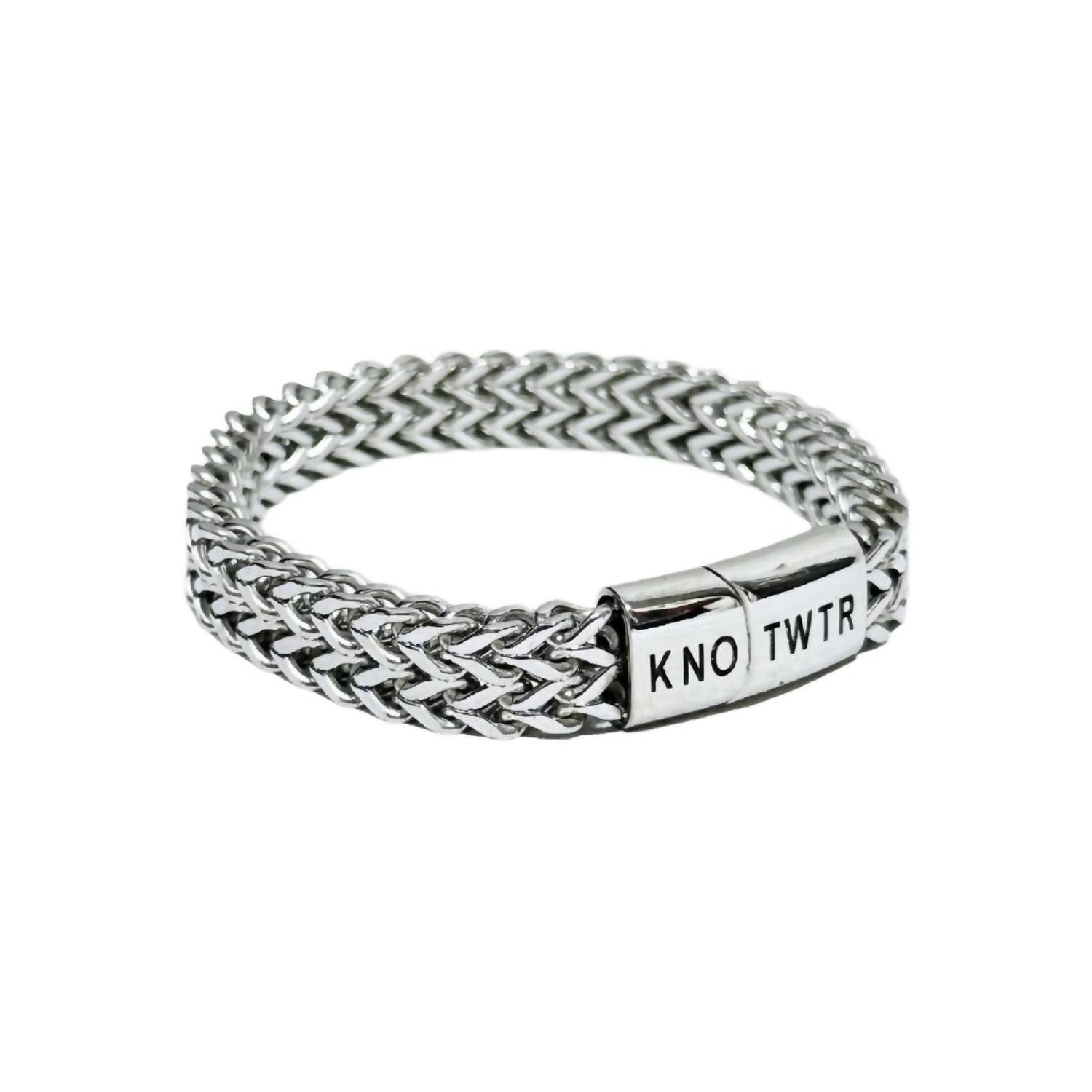 This bracelet will be your favorite go-to piece of the season. Introducing the knotWTR Unisex Bracelet in a sophisticated platinum hue, a perfect blend of luxury and minimalism. This piece is expertly crafted from premium stainless steel, ensuring both durability and a sleek, polished finish. Available in sizes 19, 21, and 23, it features an engraved logo that adds a touch of elegance. This versatile bracelet complements any ensemble, making it a timeless addition to your jewelry collection.
