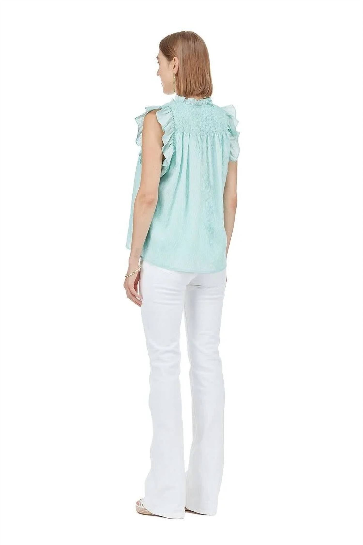 Showcases a shell-like texture that adds a unique dimension to the design. It features a 2-button, half-length placket on the front for easy wear, along with smocked shoulders and a ruffle collar for a feminine touch.