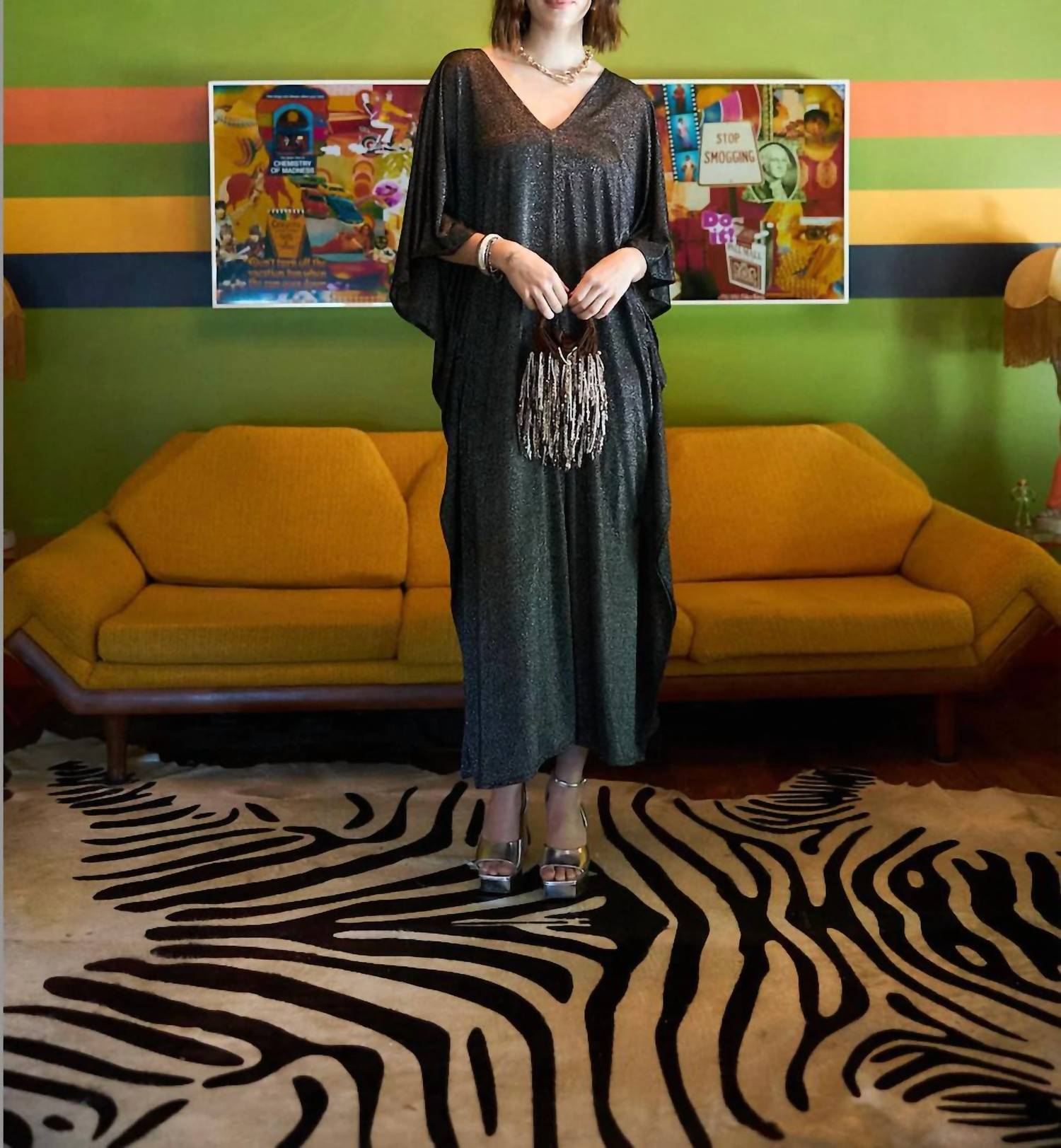 Just add slides or mules and you are good to go. Introducing the Starman Kaftan Maxi Dress by Tela, a sophisticated choice for your next dinner party or New Year’s Eve celebration. This dress in versatile black features a V-neckline and three-quarter cape sleeves, offering an elegant, textured look. At 50 inches shoulder-to-hem, its One size fits sizes S-XXL and is designed with a pull-on closure for ease. Made for maximalist style, care requires dry cleaning to maintain its luxurious feel.