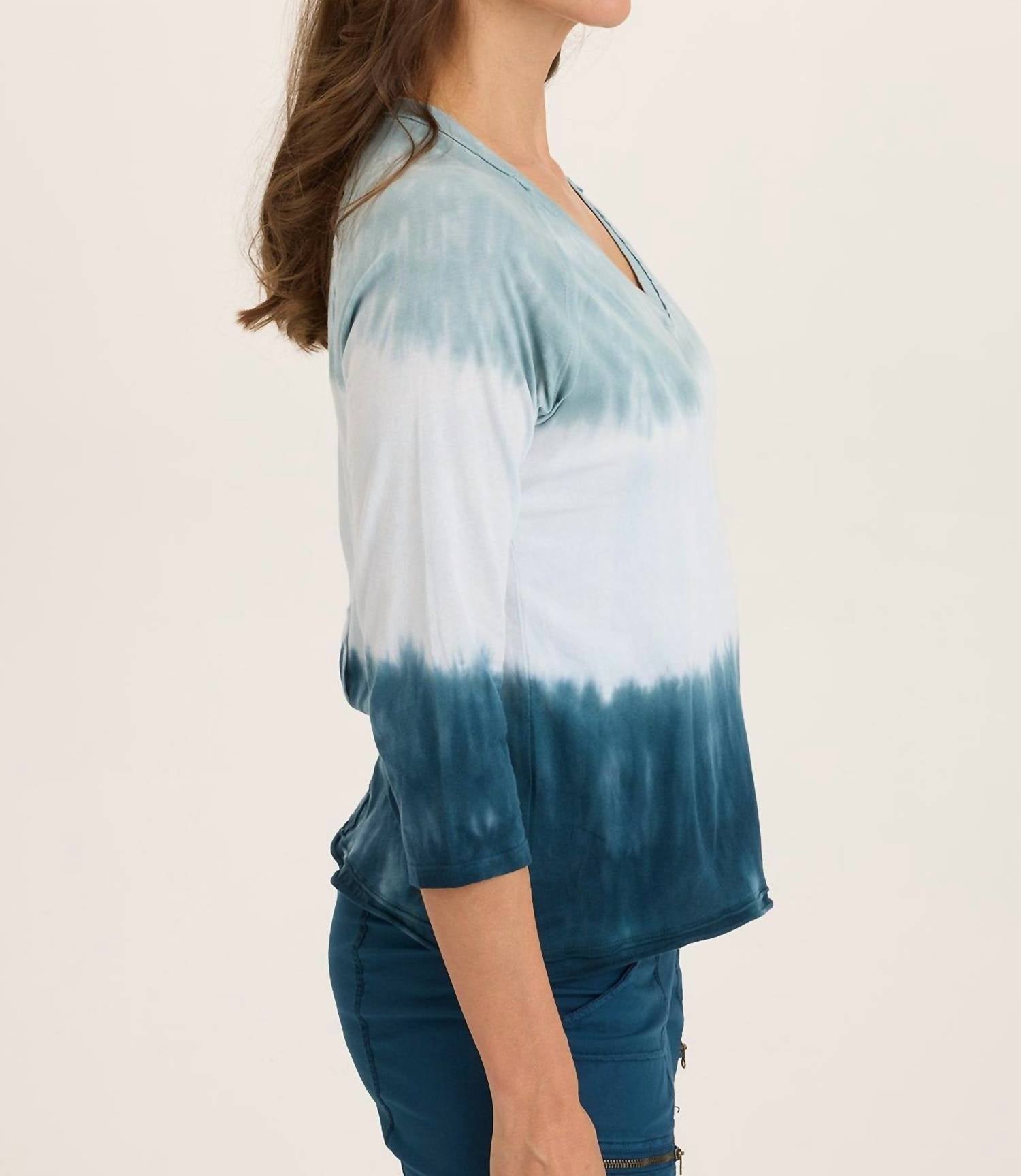 The perfect long sleeve tee that goes with just about anything. Experience the vibrant style of the Maven Tie-dye Top by XCVI, perfect for your summer wardrobe. This women’s tee features a V-neck and three-quarter sleeves, enhancing its classic jersey silhouette. Crafted from 100% cotton, it showcases a stunning Tricolor Ombre Tie-dye pattern. Closure: Button closure. Care: Machine wash and line dry.