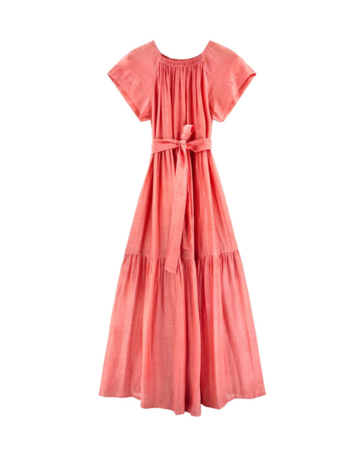 Introducing the Vienna Maxi Dress by Mirth, a stunning coral dress for women designed to bring effortless elegance to your wardrobe. With short raglan sleeves and a ruched elastic neckline, this A-line silhouette comes in a breathable cotton blend, composed of 80% cotton and 20% silk. Made in India and measuring 50.5" in length for a size small, it features practical side pockets and a matching tie belt for a flattering fit. Its slightly sheer fabric in sunlight adds a delicate touch, while the pull-on closure ensures easy wear. Care: Dry clean only.