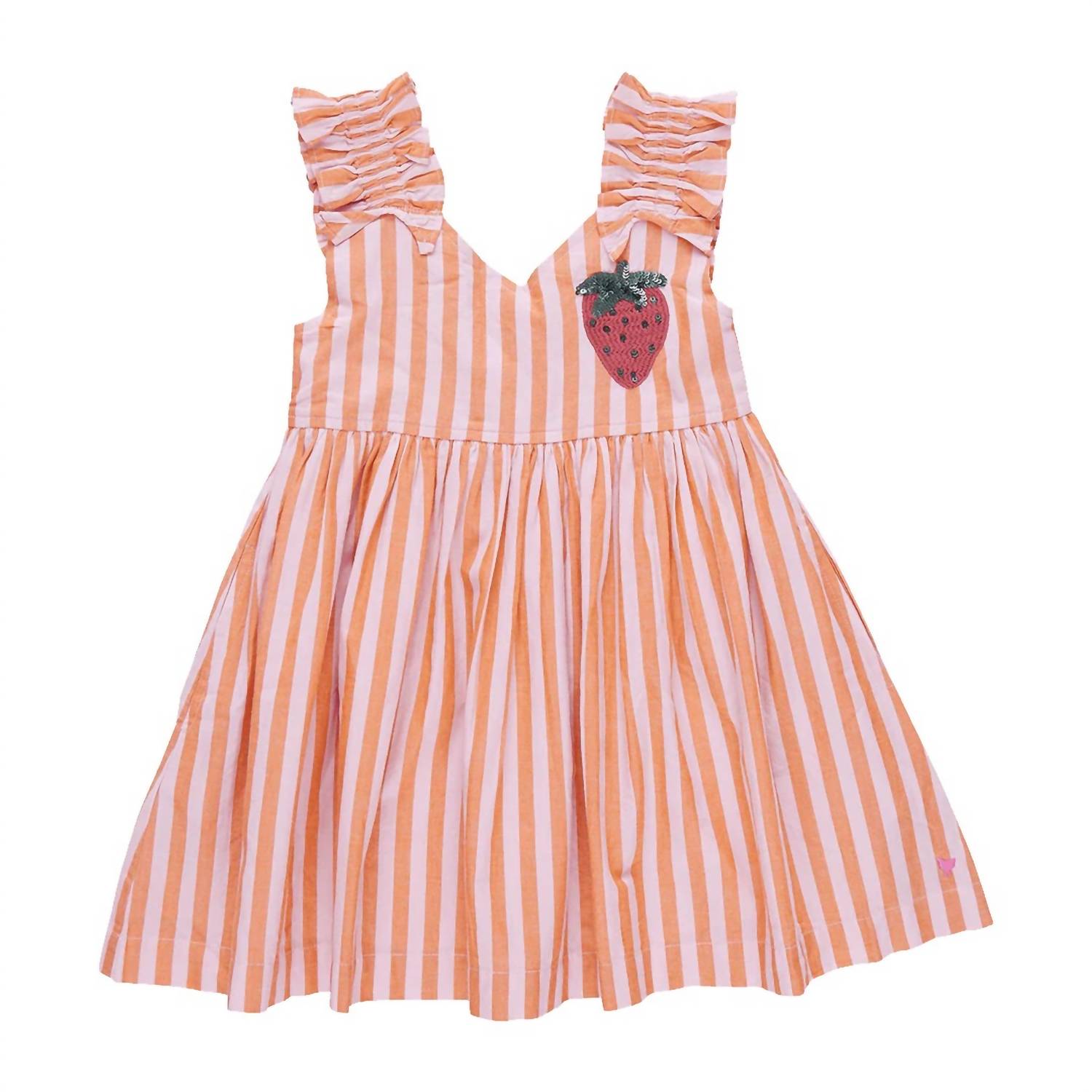 Introducing the Girls Via Dress by PINK CHICKEN, a delightful choice for any sunny occasion in Orange and Pink Stripe. Featuring ruched shoulder straps, this dress is made from 100% yarn-dye cotton and showcases a charming strawberry detail on the chest. The back is elegantly finished with an invisible zipper for easy wear. Crafted with care in India, it is easy to maintain with a hand wash cold or gentle cycle, and can be tumble dried on low for convenience.