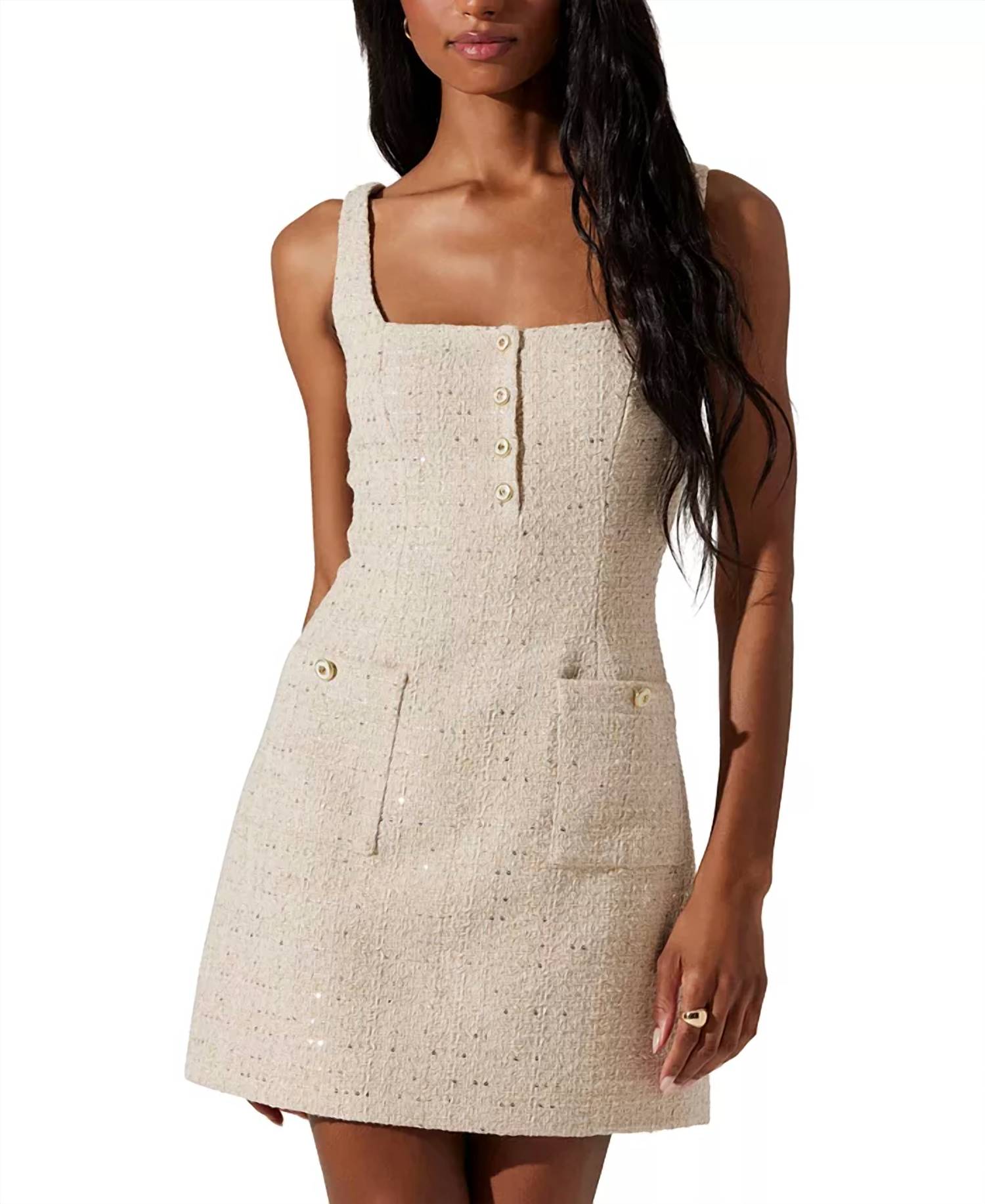 Presenting the DEANNA DRESS CREAM GOLD by ASTR, a masterpiece for those who crave elegance. This sleeveless mini dress features a textured, creamy gold design, highlighting a sophisticated squareneck and an A-line silhouette. Crafted for the modern woman who delights in opulent luxury, this piece ensures you'll feel like royalty. Closure: None.