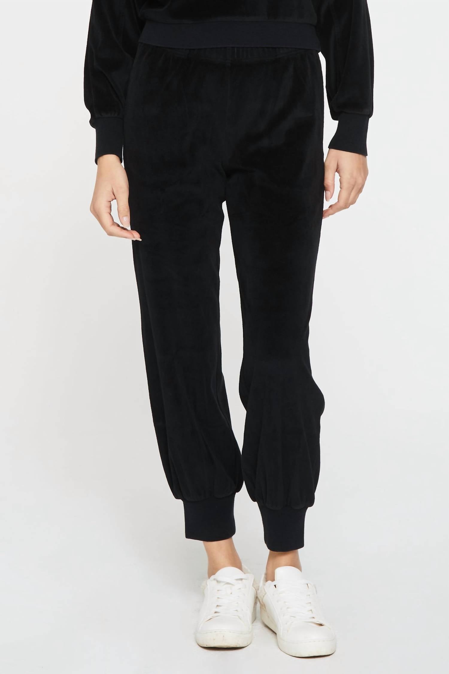 Pair these with your favorite sneakers for an effortlessly cool look. Discover the Lusya Joggers by Another Love, crafted for ultimate comfort and style in solid black. These joggers feature a high-rise waist with an elastic pull-on closure, trimmed with contrast rib cuffs for a sleek, ankle-length silhouette. Made from a luxurious cotton blend of 80% cotton and 20% polyester, and imported from China, they offer a velvety touch that's perfect for both lounging and outings. Care for them effortlessly with a machine wash and tumble dry. 11" front rise, 10" leg opening and 28" inseam for a size small.