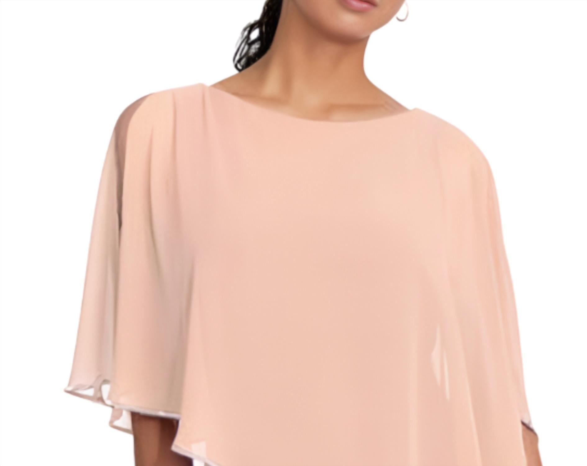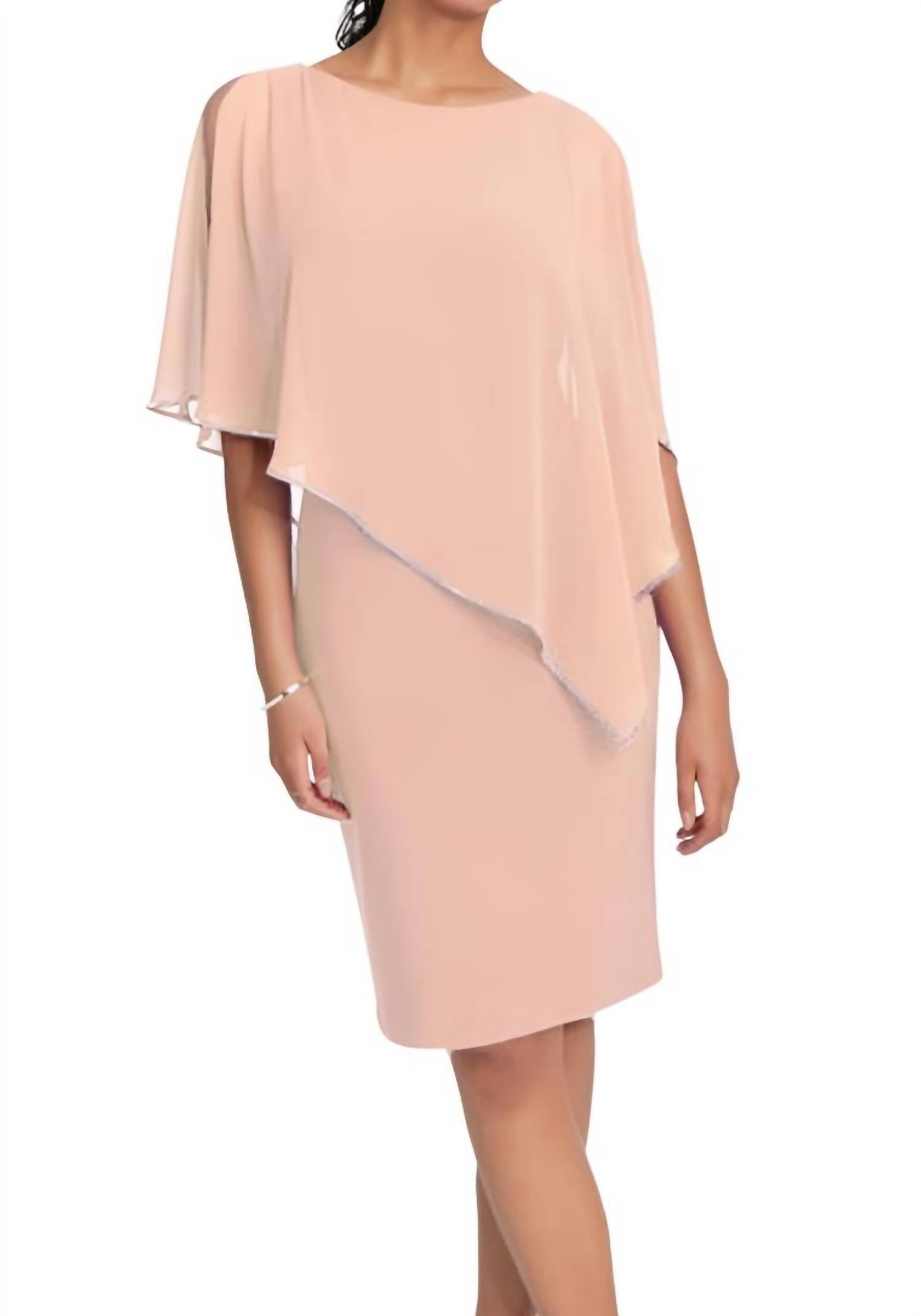 The perfect mini dress for those warmer months. Elevate your wardrobe with the Joseph Ribkoff Chiffon Cape Diamante Trim Dress in a beautifully sophisticated rose shade. This mini dress showcases short sleeves and a round neck design fit for any special occasion. Composition: Premium chiffon fabrication ensures a luxurious feel. Closure: Easy pull-on style. Care: Dry clean only. Perfect for anniversaries or Mother's Day celebrations.