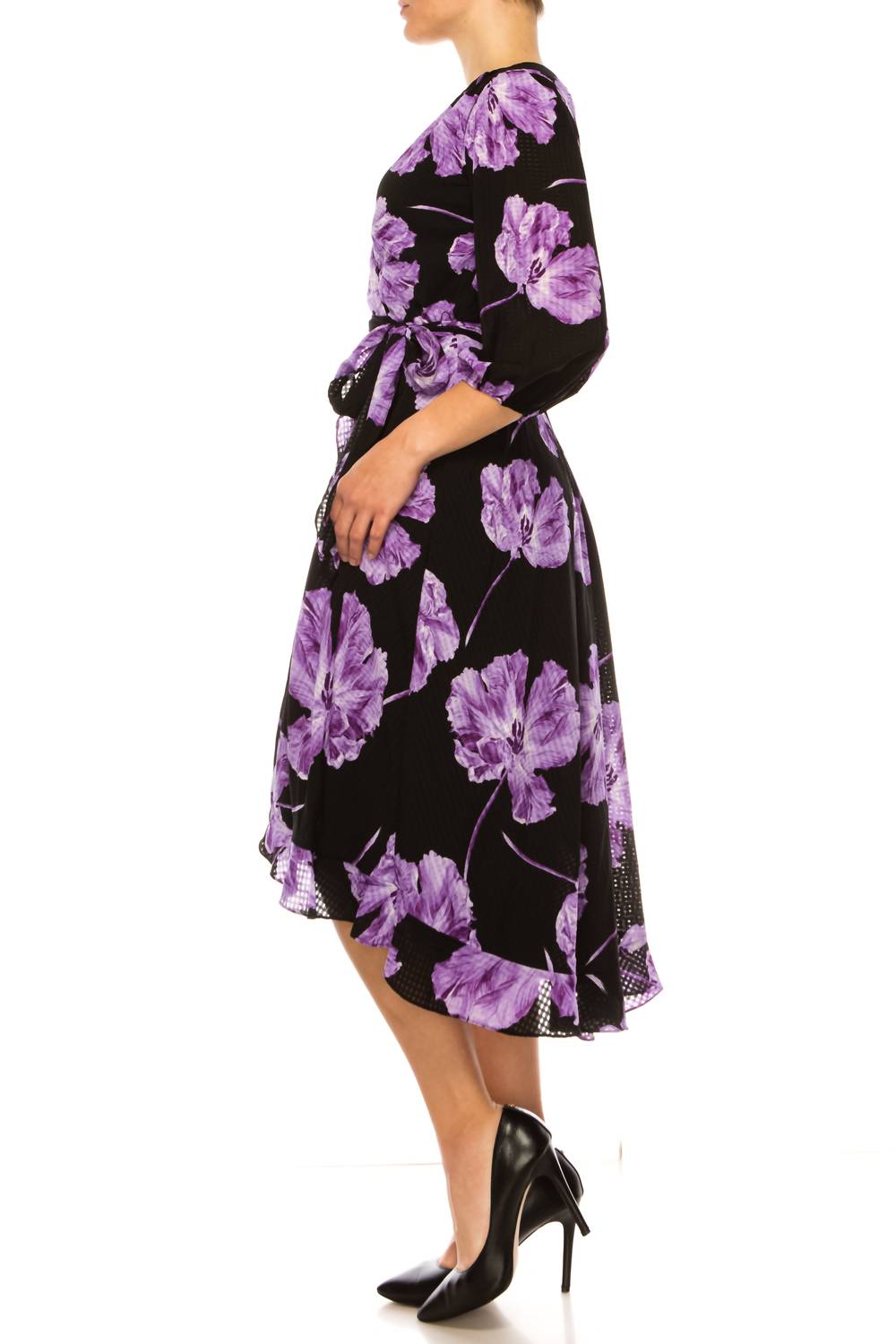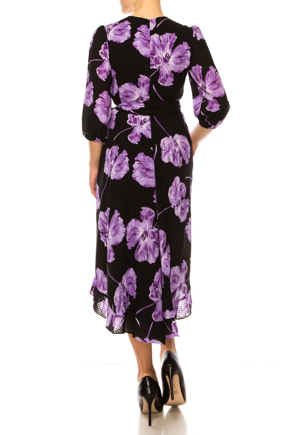 Just add slides or mules and you are good to go. Step into elegance with the Faux Wrap Floral Midi Dress by Maison Tara, featuring a chic square and flowery print. Designed with three-quarter sleeves, this piece boasts a sash belt and a frilly trim skirt for added flair. Crafted from 100% polyester and fully lined, the dress ensures comfort and style. Closure: Zip closure. Care instructions: Hand wash cold.
