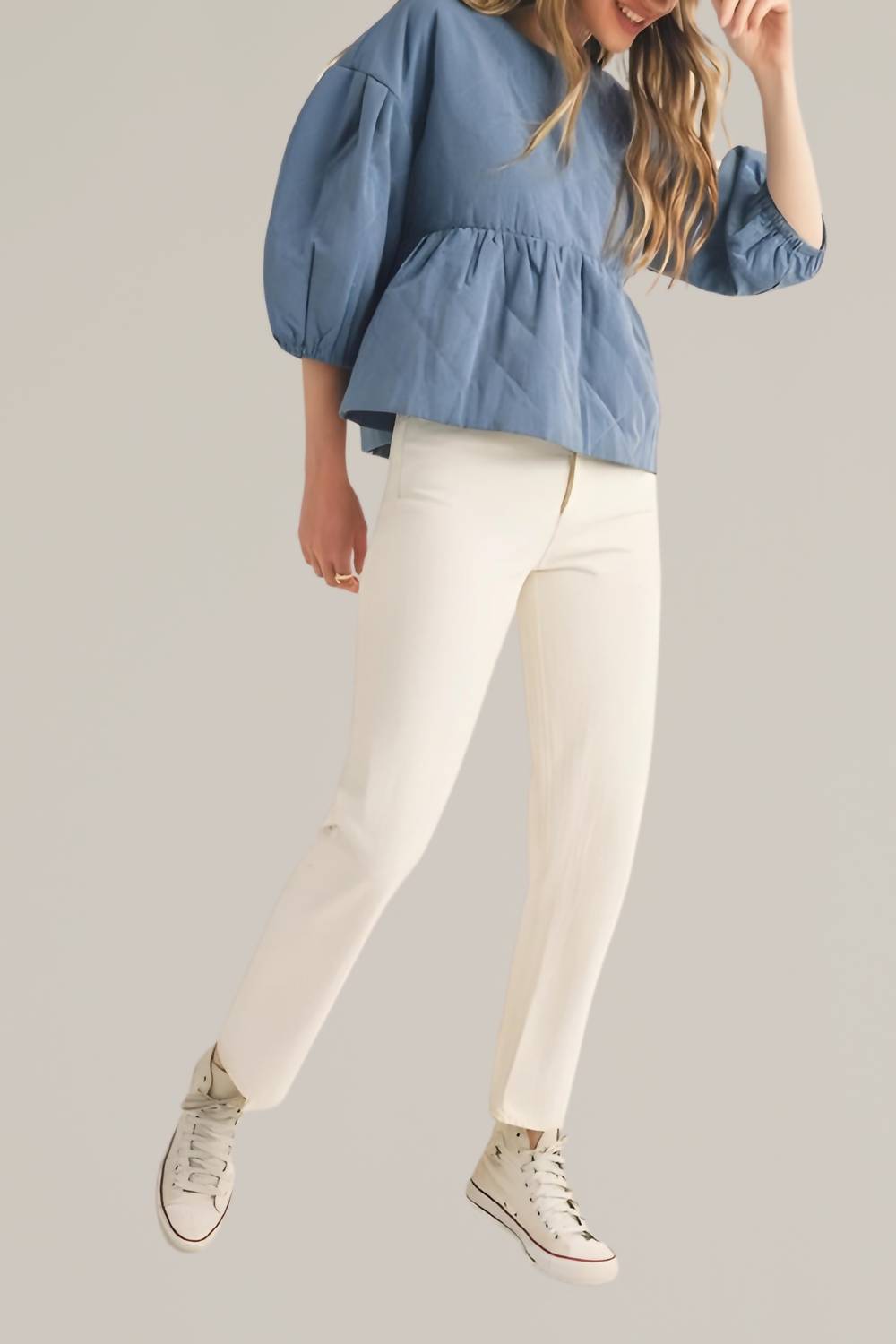 Introducing the Quilted Babydoll Top by &merci, blending rugged denim charm with quilted softness for everyday elegance. Sleeve Length: Three-quarter Sleeve. Composition: Shell 78% polyester, 20% cotton, 2% spandex; Lining 100% polyester. Closure: Zip closure. Care Instructions: Hand wash cold, line dry. Achieve a versatile, on-trend look with this textured, crewneck blouse. Ideal for pairing with white jeans and sneakers. Model is wearing a size small [5'10" height, 32" bust, 24" waist, 36" hips].