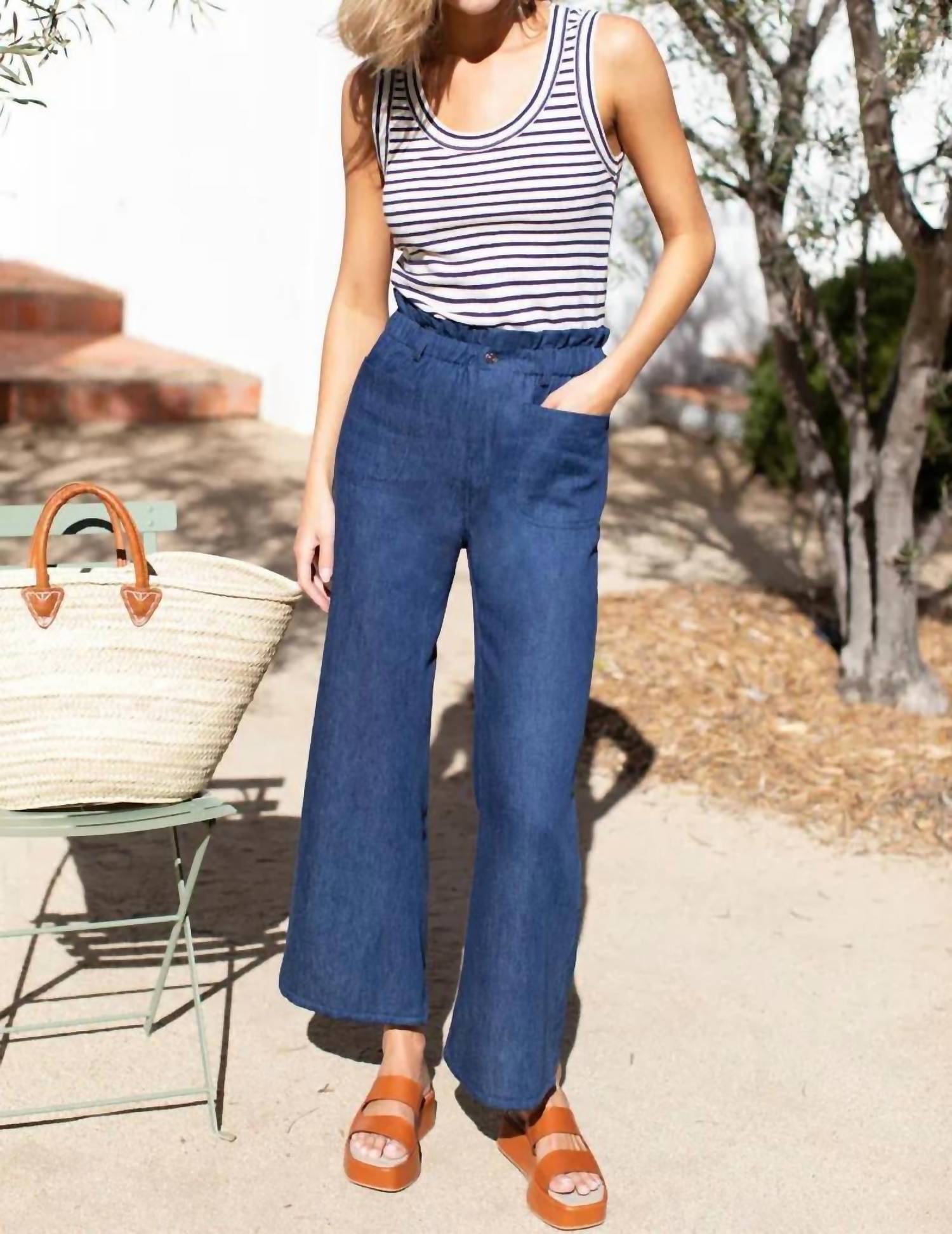 Stay on trend with these stylish boot cut pants that are fit to perfection. The perfect combination of comfort and fashion, you'll be grabbing for these all season long! Elevate your wardrobe with the Zip Front Tulip Crop Flare Pant by EMERSON FRY, crafted for women in an Indigo hue for a modern look. These pants feature a high elastic waist with paper bag detail and are made from a sustainable blend of 55% hemp and 45% organic cotton, designed with patch pockets and a zip fly with button closure. The flared leg and cropped fit make them a stylish, relaxed fit option for any occasion. Made in NYC, care for your pants by machine washing and laying flat to dry.