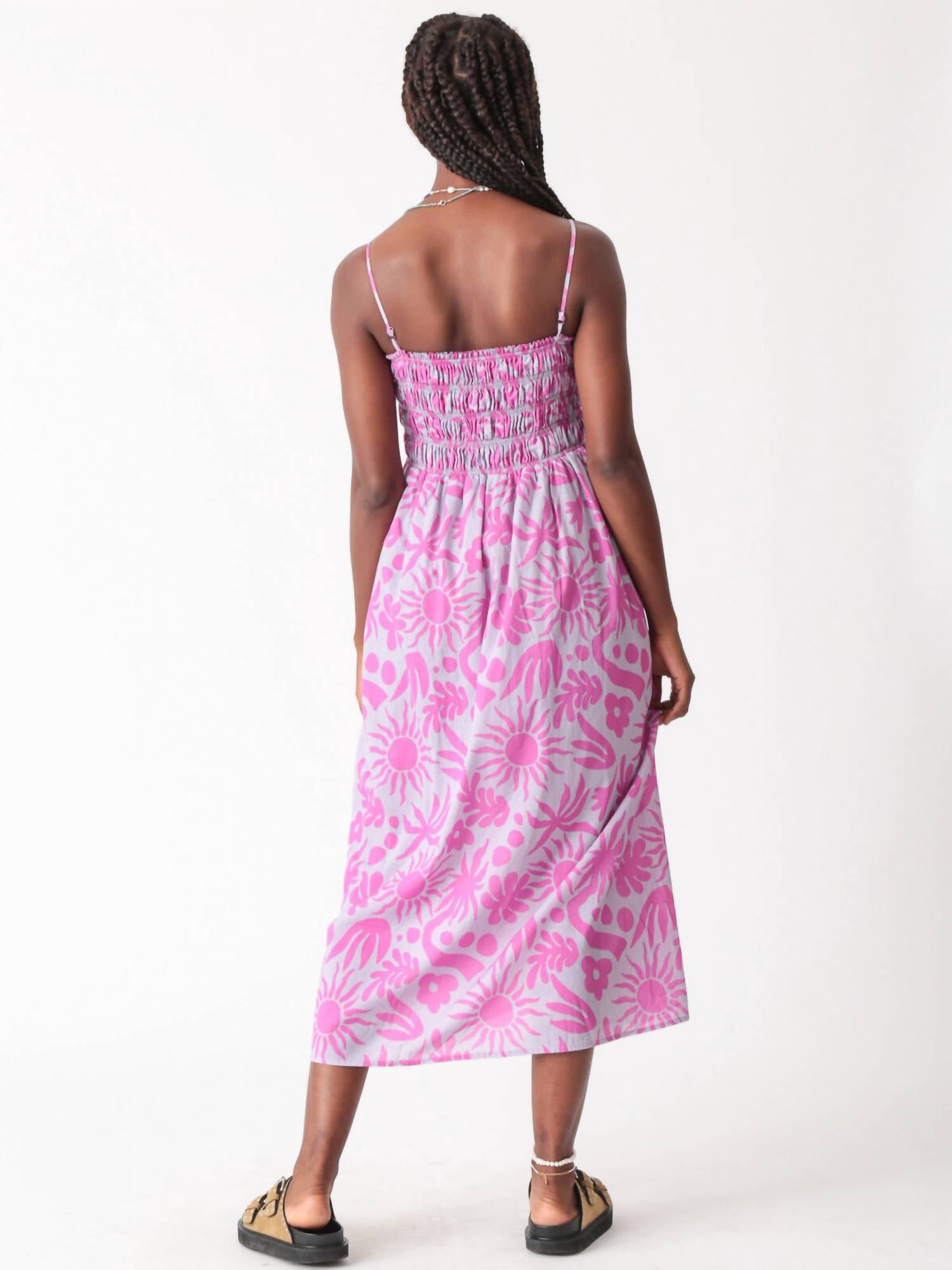 The perfect length dress does exist. Meet the Electric & Rose Camilla Dress, a stunning midi dress in the vibrant Sunny Bloom pattern designed to brighten any occasion. This dress boasts delicate spaghetti straps and a flattering square neckline. Crafted from a comfortable cotton blend and featuring a pull-on style, this A-line silhouette ensures both elegance and ease. For care, it requires dry cleaning.