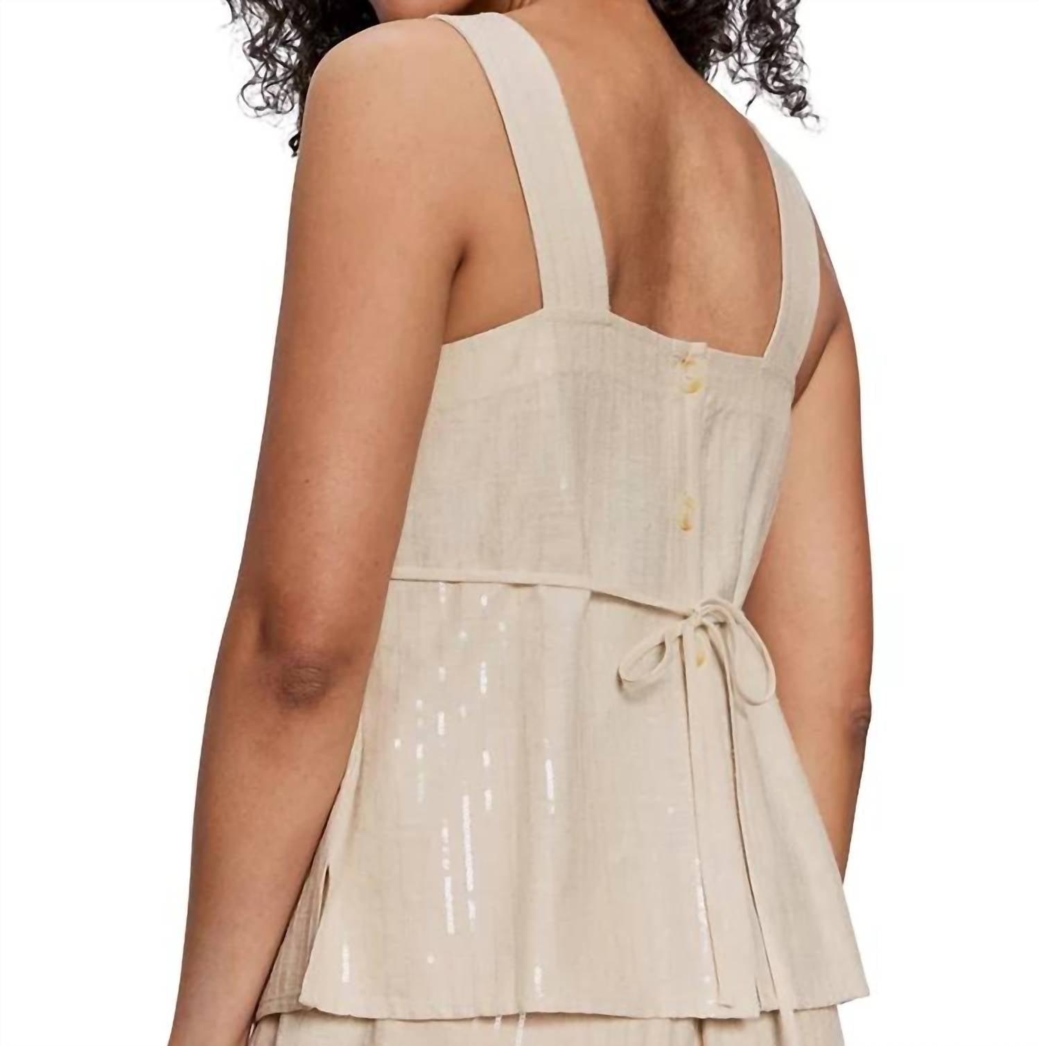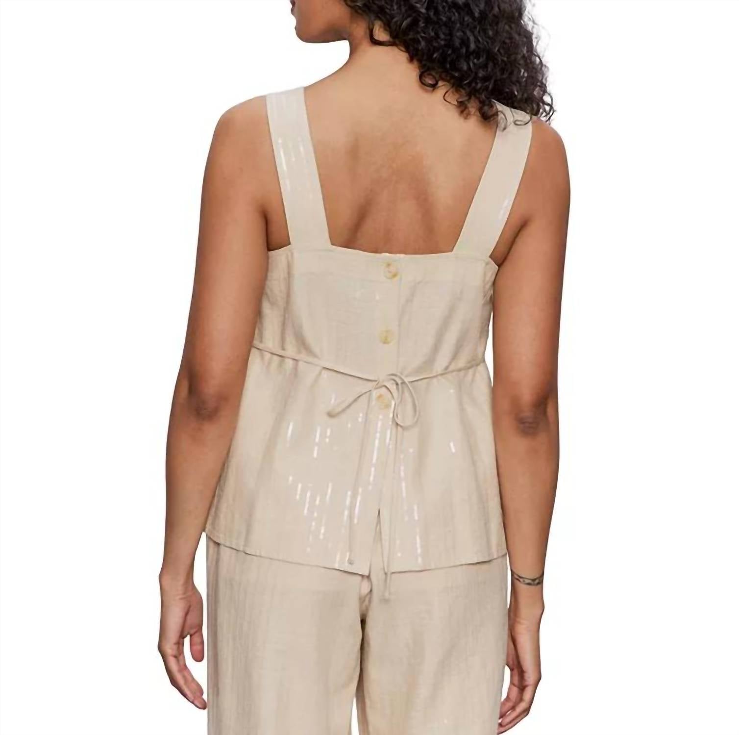 This classic tank top is perfect for layering and cute enough to wear on its own. Introduce a touch of glamour to your wardrobe with the Sanctuary Desert Square Neck Tank Top in Sand. This sleeveless top features a sequin square-neck and a button closure at the back, perfect for holiday parties or adding sparkle to your summer workwear. Made from 92% Rayon, 8% Linen, it offers a chic, solid pattern that pairs easily with various outfits. For lasting quality, hand wash and line dry as recommended.