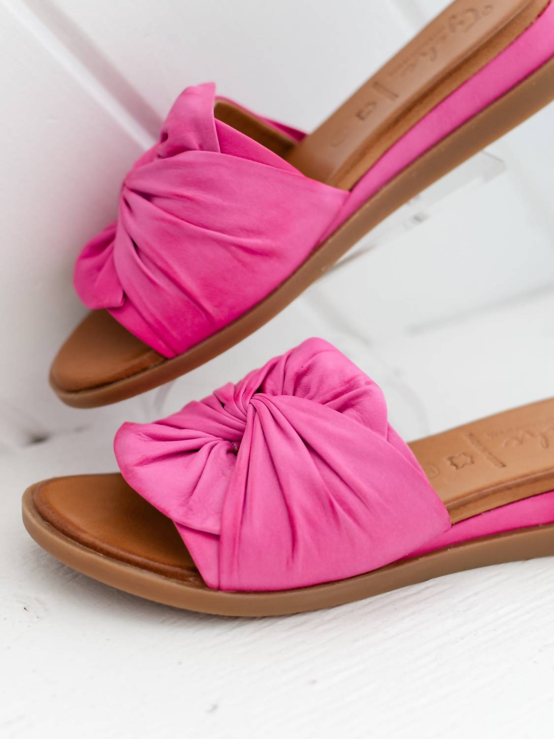 This sandal will take you from brunch to dinner and everything in between. Step into effortless elegance with the Women's Sassy Leather Slide Sandal by Tyche in vibrant Fuchsia. Designed for the fashion-forward, these leather sandals feature a sleek slide silhouette and a comfortable low heel, ranging from 1 1/4" to 2", perfect for summer occasions and anniversary celebrations. The Y2K trend-inspired design offers both style and comfort, making it an ideal choice for Mother's Day gifts. Embrace the round toe and elevate your casual and special occasion looks effortlessly.