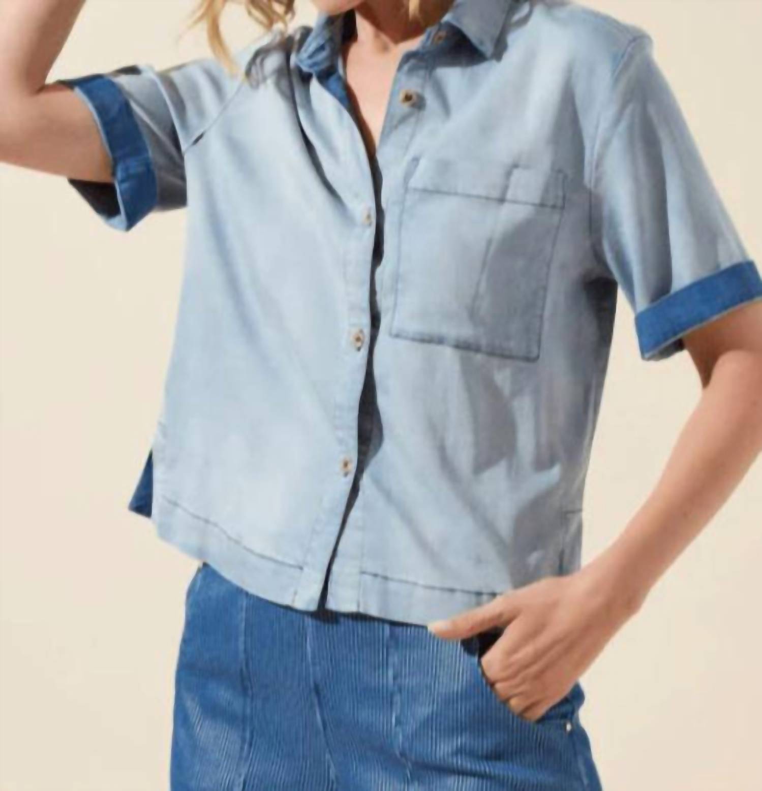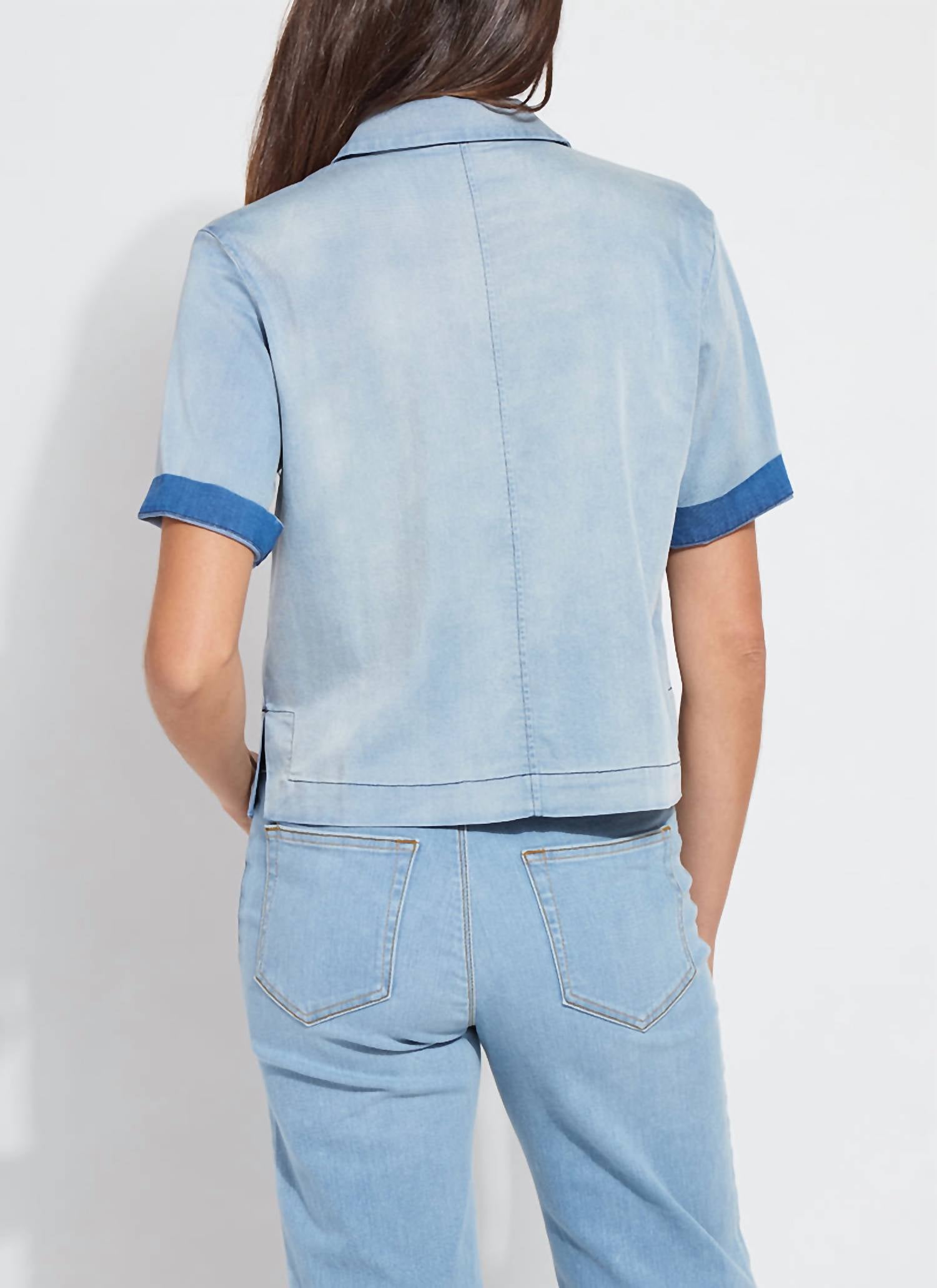The short sleeve tee you'll want in every color. Introducing the Lysse Bianca St Chambray Short Sleeve Top in a striking Bleached Blue, perfect for a casual yet polished look. This women's top features short sleeves and a smart collar, complemented by a front button closure and a convenient front pocket. Crafted from a blend of 63% Lyocell, 25% Polyester, 11% Viscose, and 1% Elastane, it offers a comfortable slim fit with a 2-way stretch for ease of movement. Embrace its chic, bleached finish and solid pattern for a versatile addition to your summer workwear or vacation wardrobe.