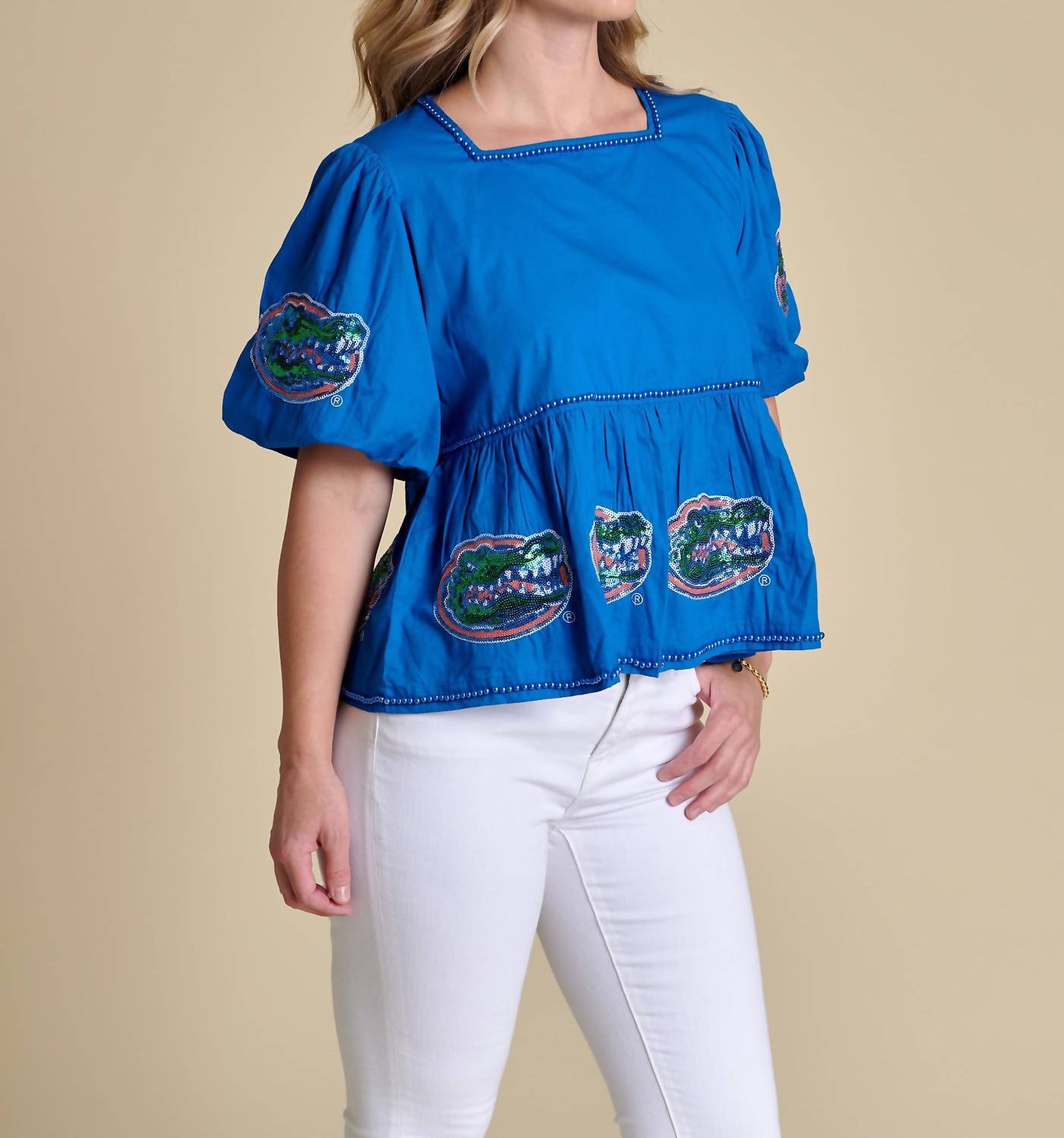 Look no further, you just found your perfect tee! Stewart Simmons introduces the Puff Sleeve Peplum Top Florida, a short sleeve tee crafted from breathable cotton, ideal for game day or summer outings. This blue top features a chic graphic pattern and a flattering peplum silhouette with elegant puff sleeves and a modern squareneck. It's designed with a convenient pull-on closure. Care for this stylish piece is simple: machine wash and lay flat to dry.