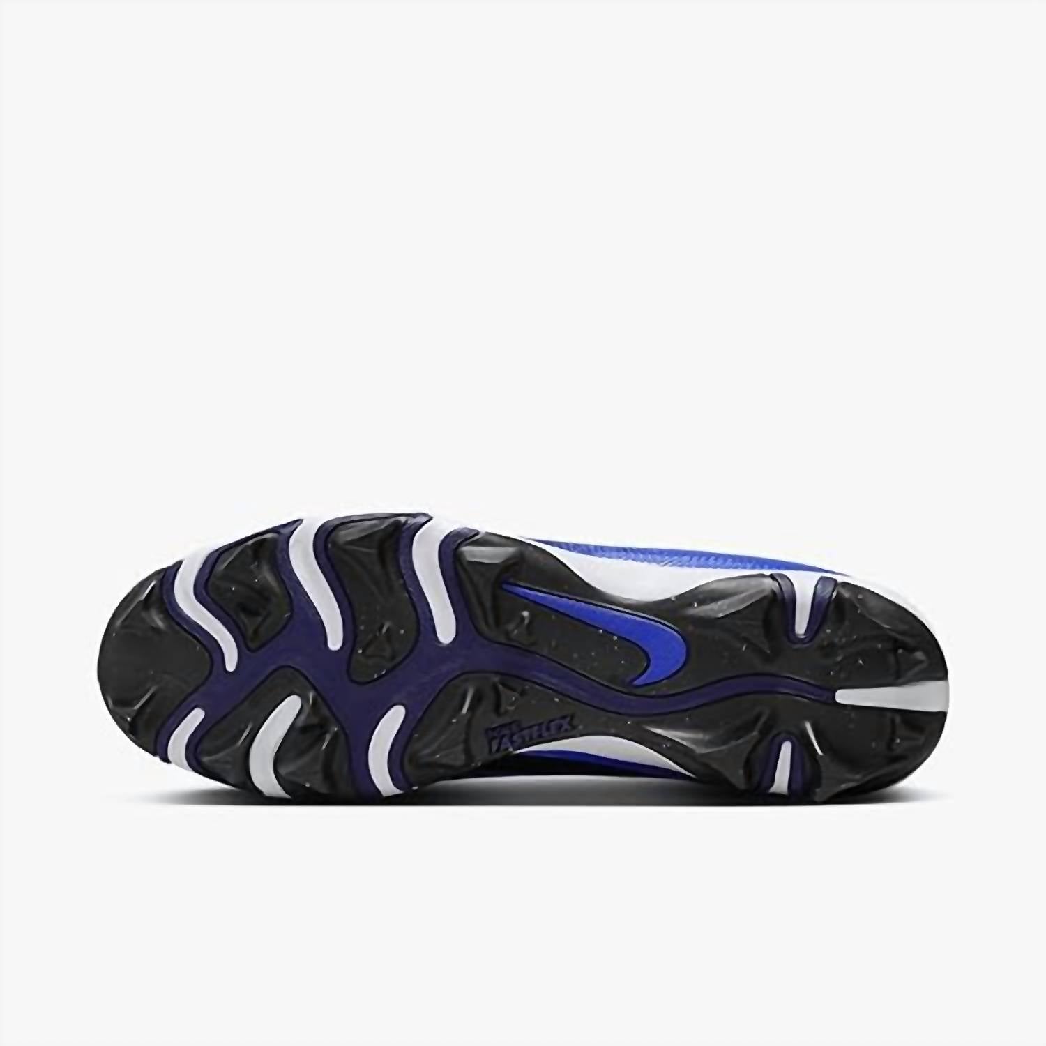 The Kid's Menace 4 Shark Bg Shoes by Nike, in vibrant hyper royal, are designed to bring out the best in young athletes. Featuring breathable mesh and synthetic leather, these sneakers provide both comfort and durability, essential for active play. Nike's Fastflex technology paired with rubber studs ensures flexibility and traction, enabling quick bursts of speed and agile movements. The shoe's design is enhanced with added wings for secure fit and a molded front for extra field toughness, making them ideal for toddlers.