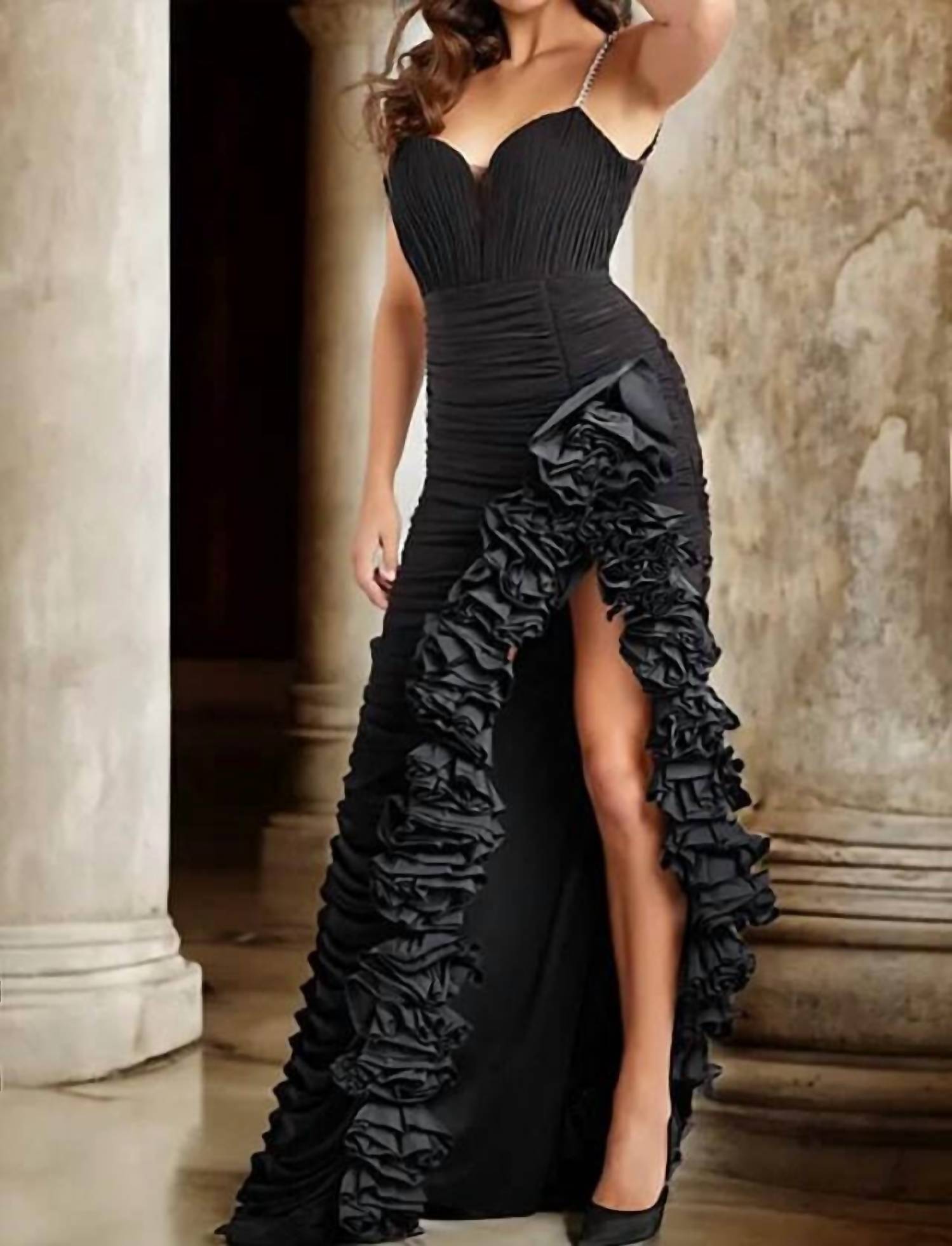 A maxi dress that is just as cute as it is comfortable. Introducing the Ruffled Slit Beaded Gown by Jovani, a masterpiece in evening elegance. This black gown features delicate spaghetti straps and is crafted from jersey material, offering a comfortable stretch with a flattering form-fitting silhouette. The gown is floor-length with a daring high slit and ruffled trim for dramatic flair, enhanced by crystal-embellished straps that capture light beautifully.