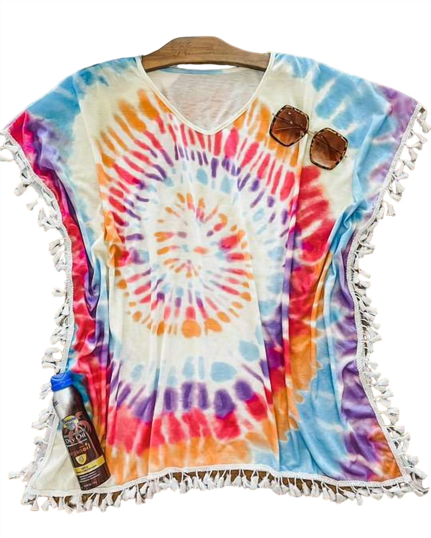 This poly/cotton blend coverup features a vibrant tie-dye pattern and fringe details, available in Regular and Plus sizes for a relaxed fit. One Size. (Size guide for regular and plus) OS - 32" W x 30" L; Plus - 34" W x 33" L. Pullover composition.