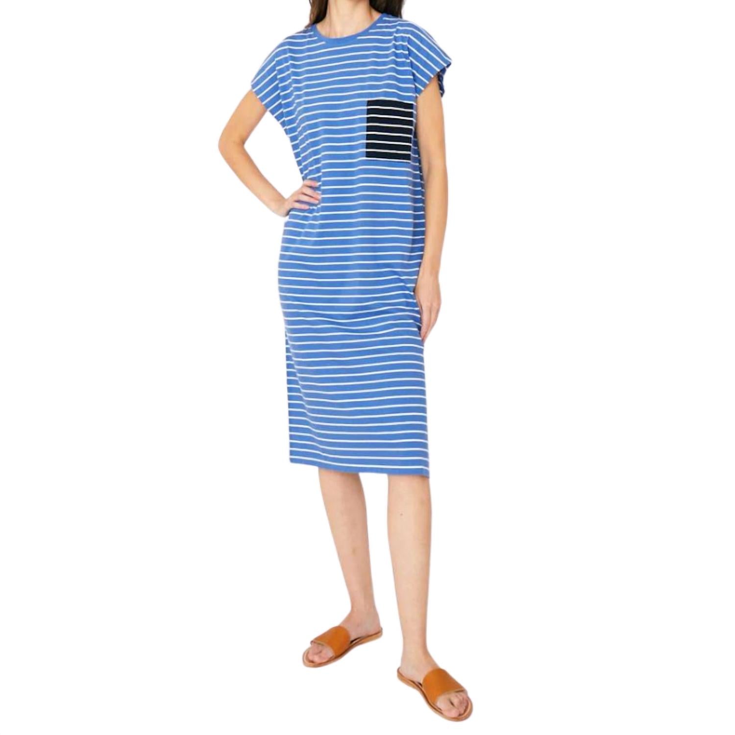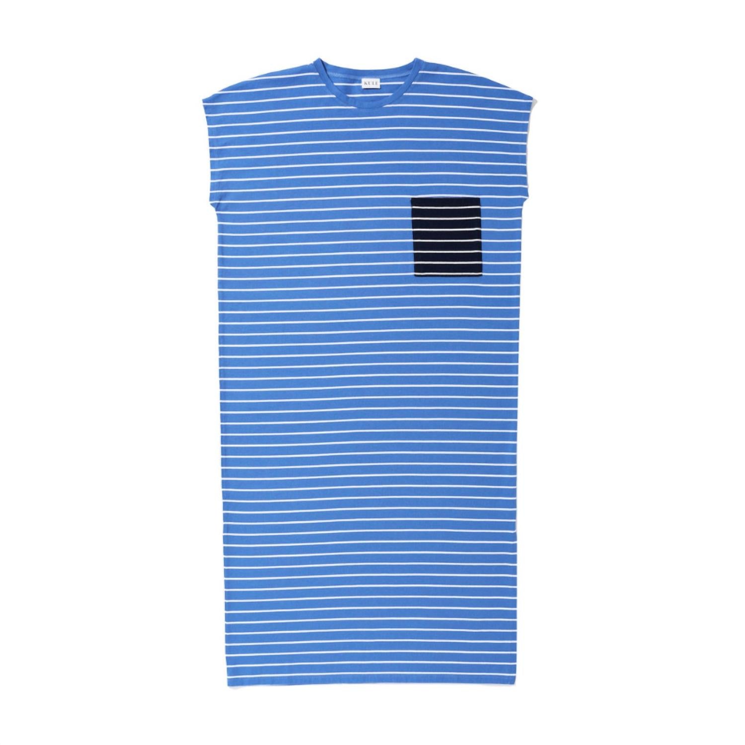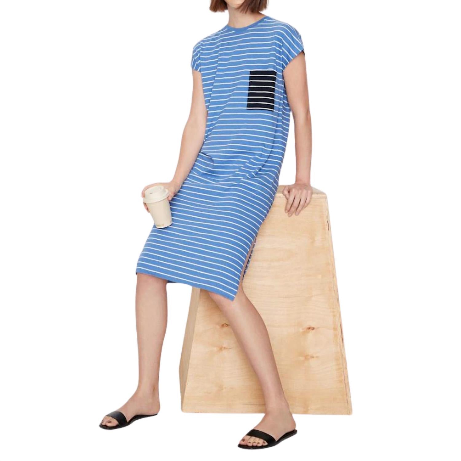 The perfect length dress does exist. Introducing the Honor Stripe Midi Dress by KULE, the ultimate tee dress for the season in a chic denim/white stripe pattern. With cap sleeves and a crewneck, this shift silhouette offers effortless style, featuring a drop shoulder and a practical contrast stripe pocket on the chest. Crafted in Portugal, this dress is made from 100% cotton and boasts a pull-on closure for easy wear. Care for it with simple machine washing and line drying, making it perfect for summer vacations and 90s fashion enthusiasts.