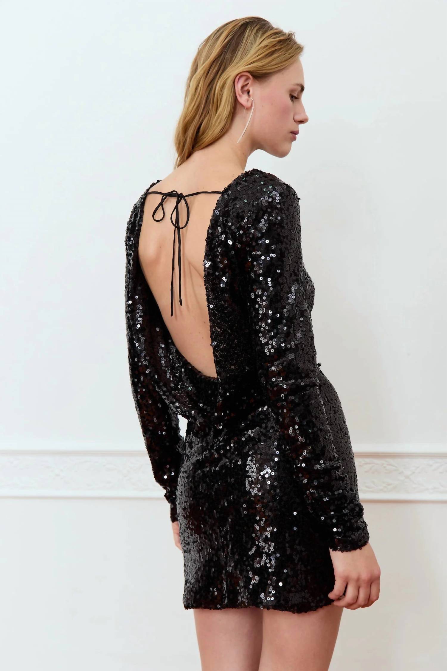 A flattering yet comfortable dress you'll be reaching for season after season. Breathtaking long sleeve mini dress that blends sophistication with flair. Black, patterned bodycon silhouette dazzles with its eye-catching sequin detail. Tie closure. Dry clean only, crafted with a boatneck for added elegance. Perfect for the style-savvy woman ready to shine.