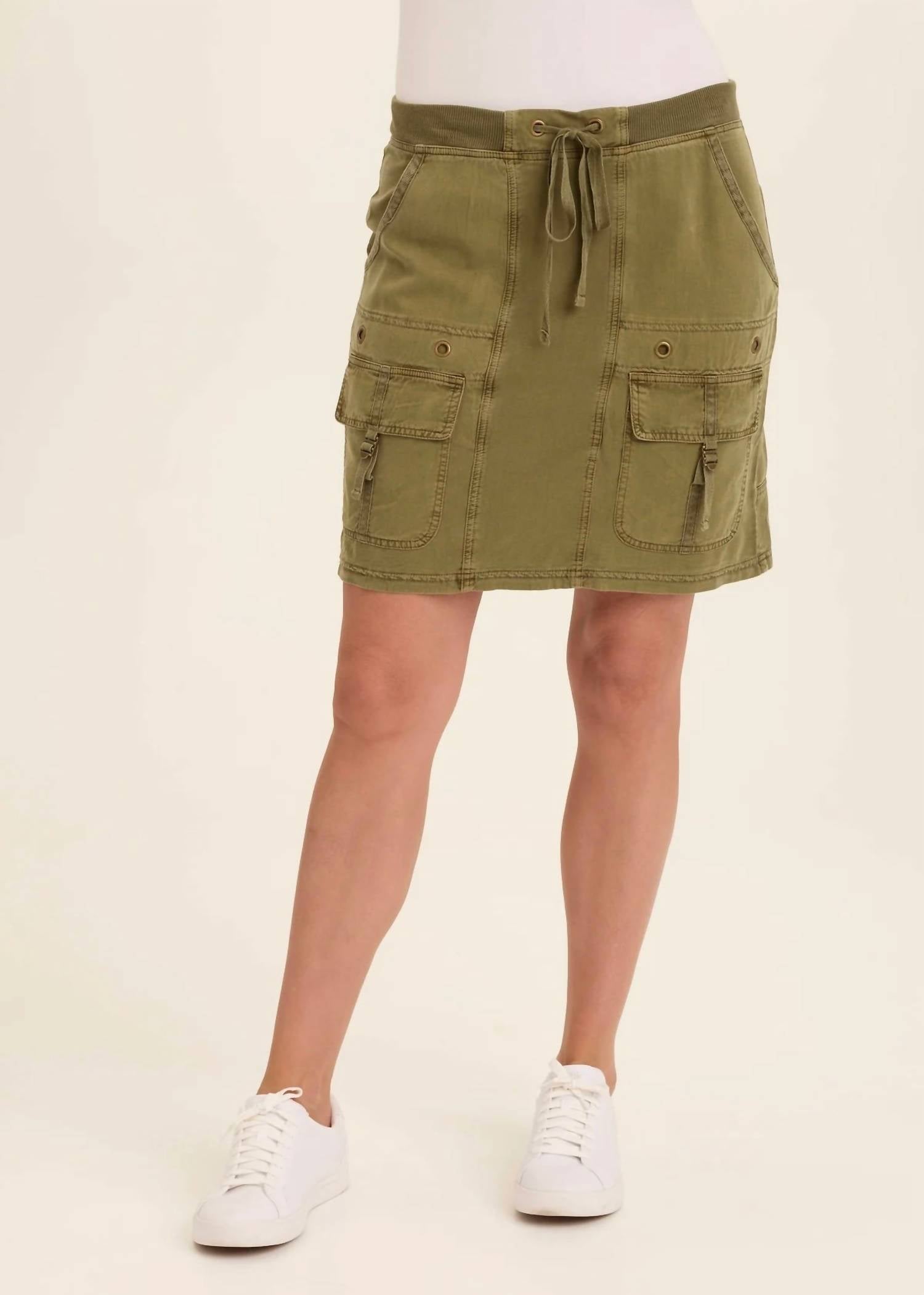 Tuck in your favorite tee for a more laid-back vibe. Introducing the XCVI Leto Cargo Skirt in a fresh Olive Green, perfect for your spring streetwear and Easter vacation needs. This mini skirt is crafted from 70% Rayon, 30% Tencel, and features a pull-on waistband with a convenient drawstring closure, accented by stylish brass hardware. With preshrunk fabric and machine-washable care, maintaining its leafy green charm is effortless. Complete with playful mini pockets, this imported skirt is a blend of comfort and functionality, ensuring you look chic on every outing.