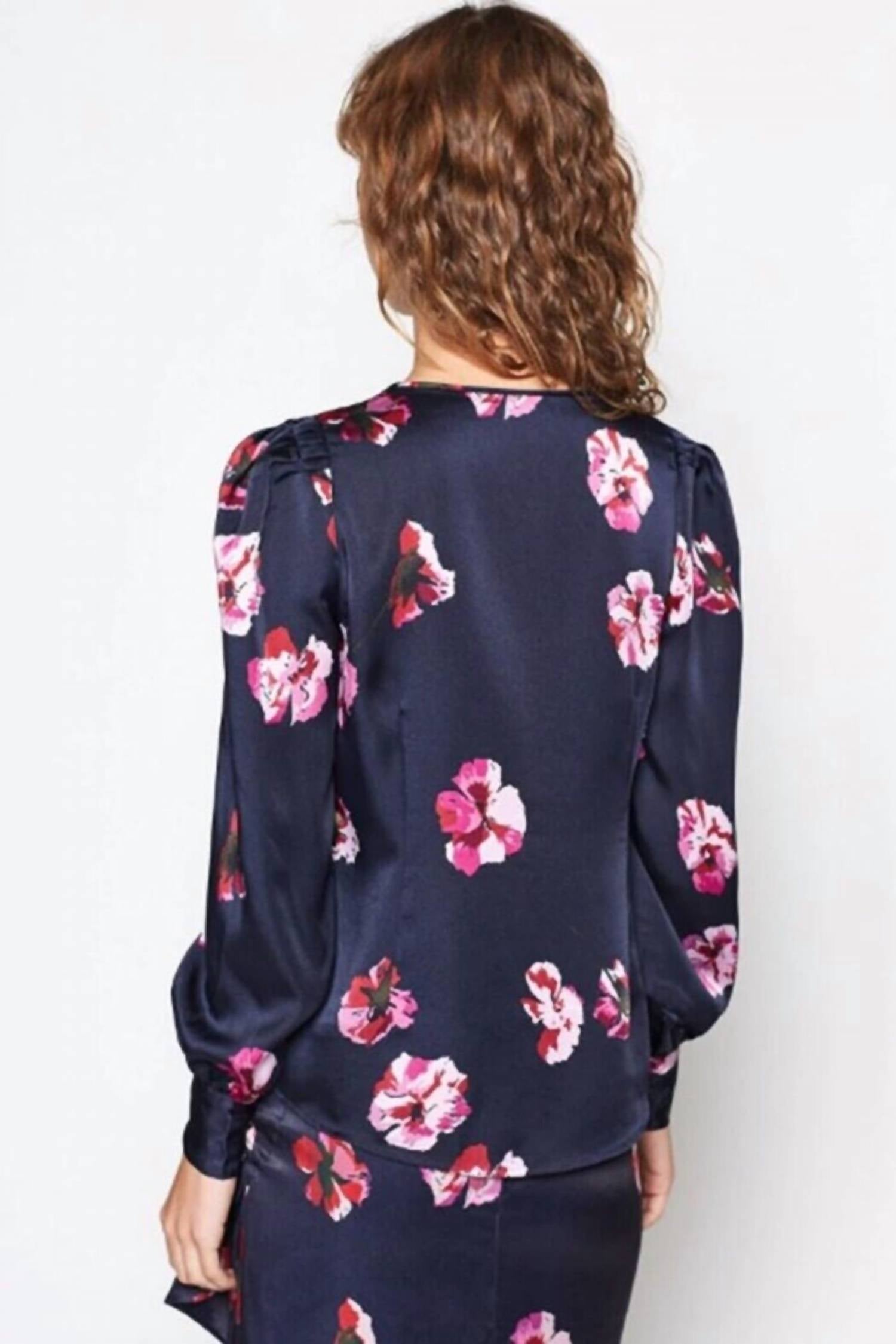 Introducing the Antonela Floral Print Satin Blouse by Joie, where effortless style meets sophisticated flair. This women's blouse features long gathered sleeves with buttoned cuffs, crafted from lustrous 100% polyester satin in a beautiful midnight blue adorned with a painterly floral pattern. The garment measures 22" from shoulder to hem, with additional dimensions of 25" sleeve length, 11" shoulder, and 16" chest. It has concealed button fastenings through the front and should be dry cleaned to maintain its mid-weight, non-stretchy fabric.