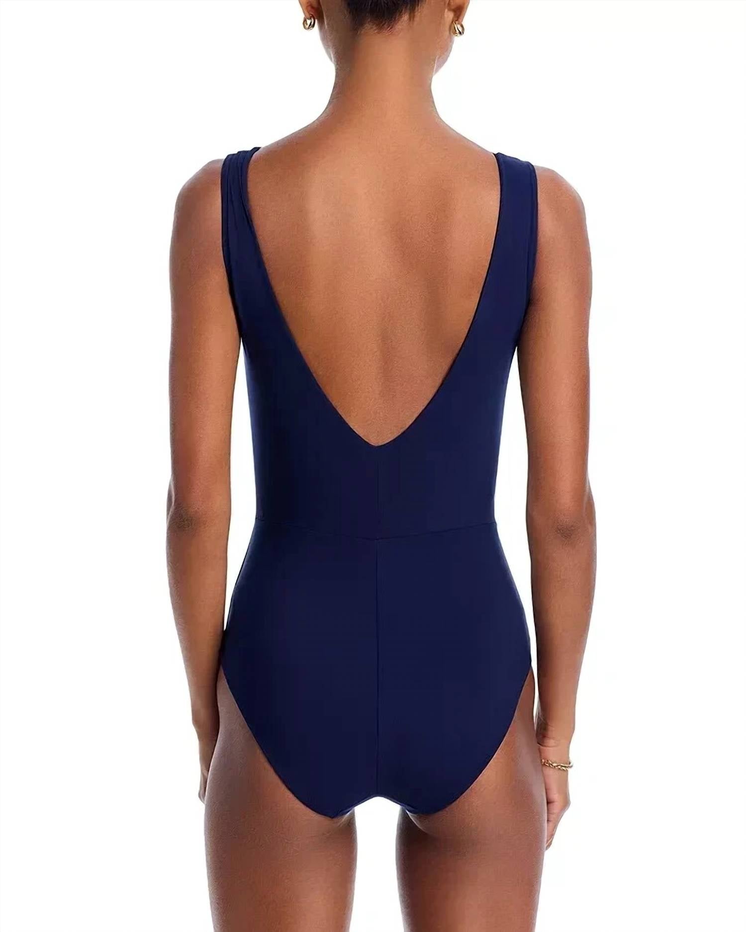 A one piece so chic you could even wear it as a bodysuit with your favorite pair of jeans. Discover the La Petite Robe Classic Filly One Piece Swimsuit by CHIARA BONI, designed for an elegant beach day in a sophisticated navy and white color-blocked style. Made in Italy, it features a flattering V-neck and fixed shoulder straps, complemented by a ruched crossover bodice and a gathered waist with a knotted detail at the center. This one-piece offers moderate coverage with a V-back and is crafted from a luxe blend of 72% polyamide and 28% elastane. Care: Professional dry clean is recommended.