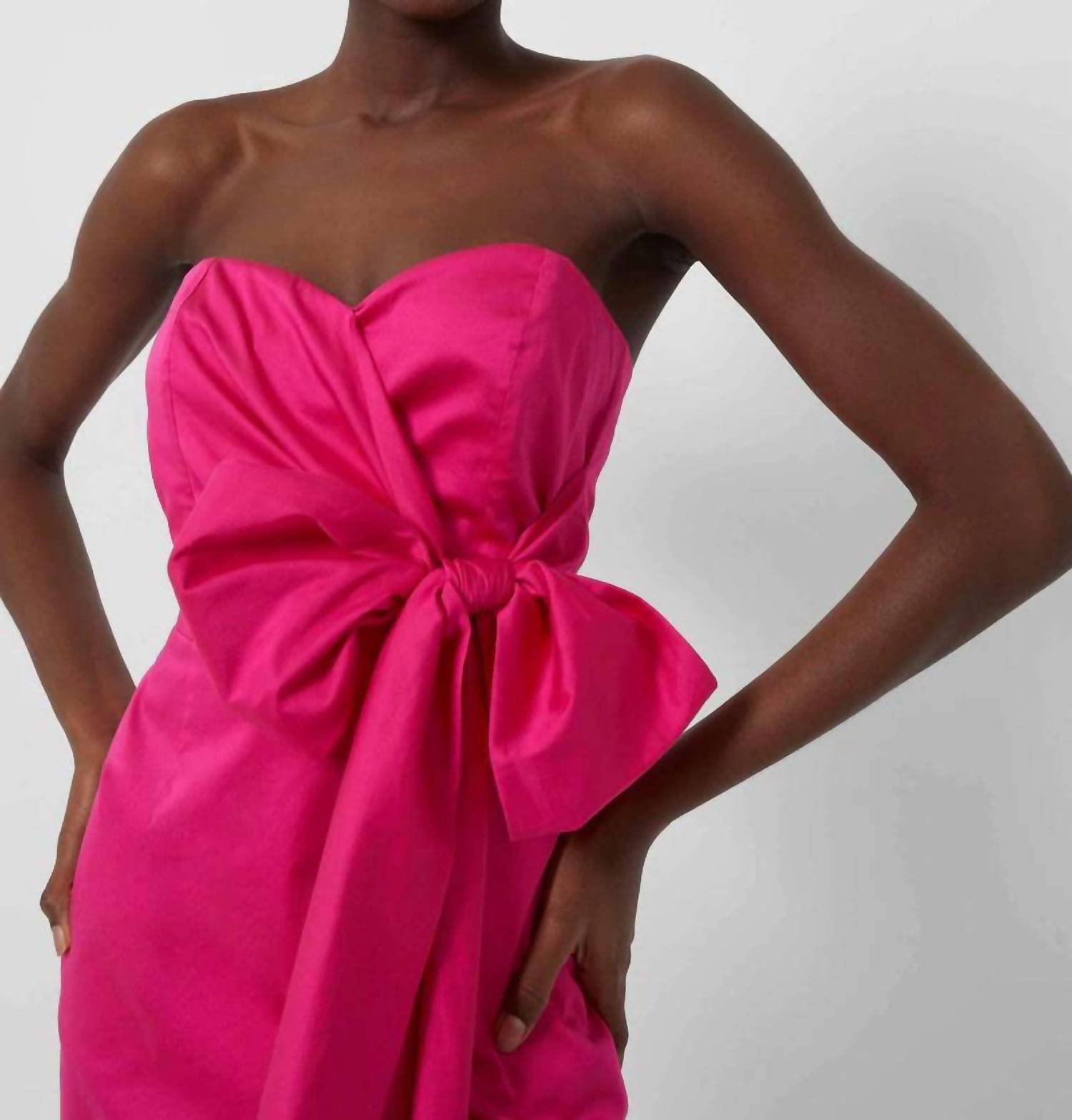 A short and breezy dress for those warmer days. Step into timeless elegance with the Florida Summer Strapless Dress by French Connection in a striking Wild Rosa. This 33-inch mini dress is crafted from a lightweight cotton blend, making it a perfect choice for any refined occasion. The strapless design highlights a classic off-the-shoulder sweetheart neckline, accentuated by a dramatic oversized bow and sleek zip back closure. Easy to care for, this dress is machine washable and promises to keep you in glamorous comfort all evening. Model is 5'10" and wears a US size 4.