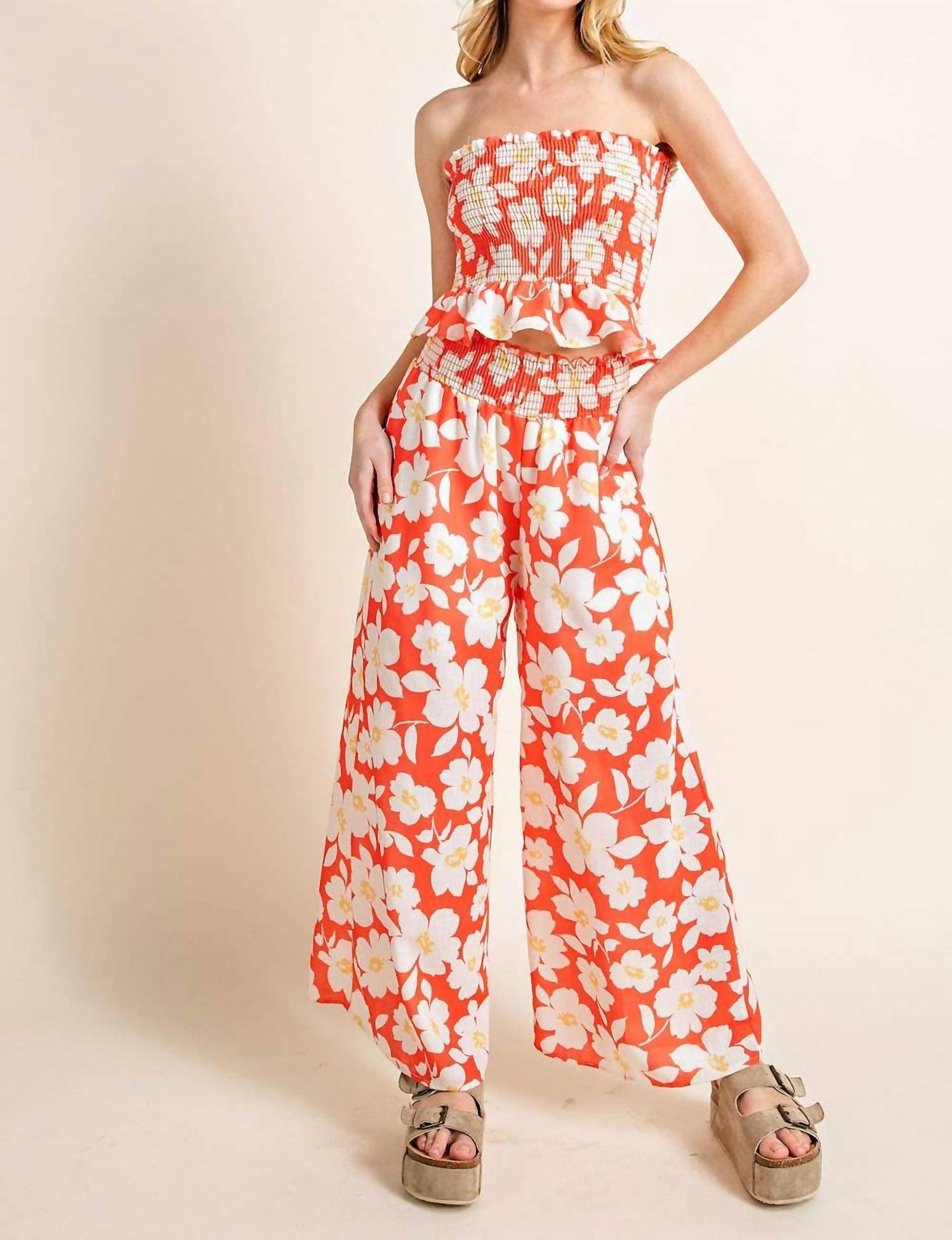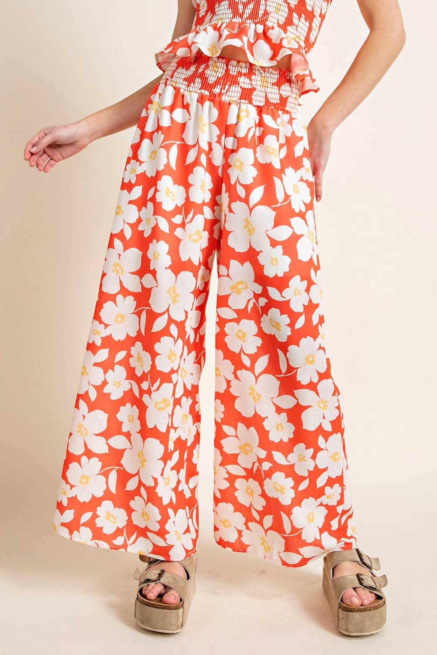 Embrace bold florals with the Smocked Band Palazzo Pants from 143 STORY, crafted for standout style in vibrant orange. These wide-leg pants feature a pull-on closure and a maximalist trend, making them perfect for summer. Designed for women, they have a stylish palazzo silhouette without pockets. Ideal for those who love making a statement, these pants require no specific wash or dry instructions.