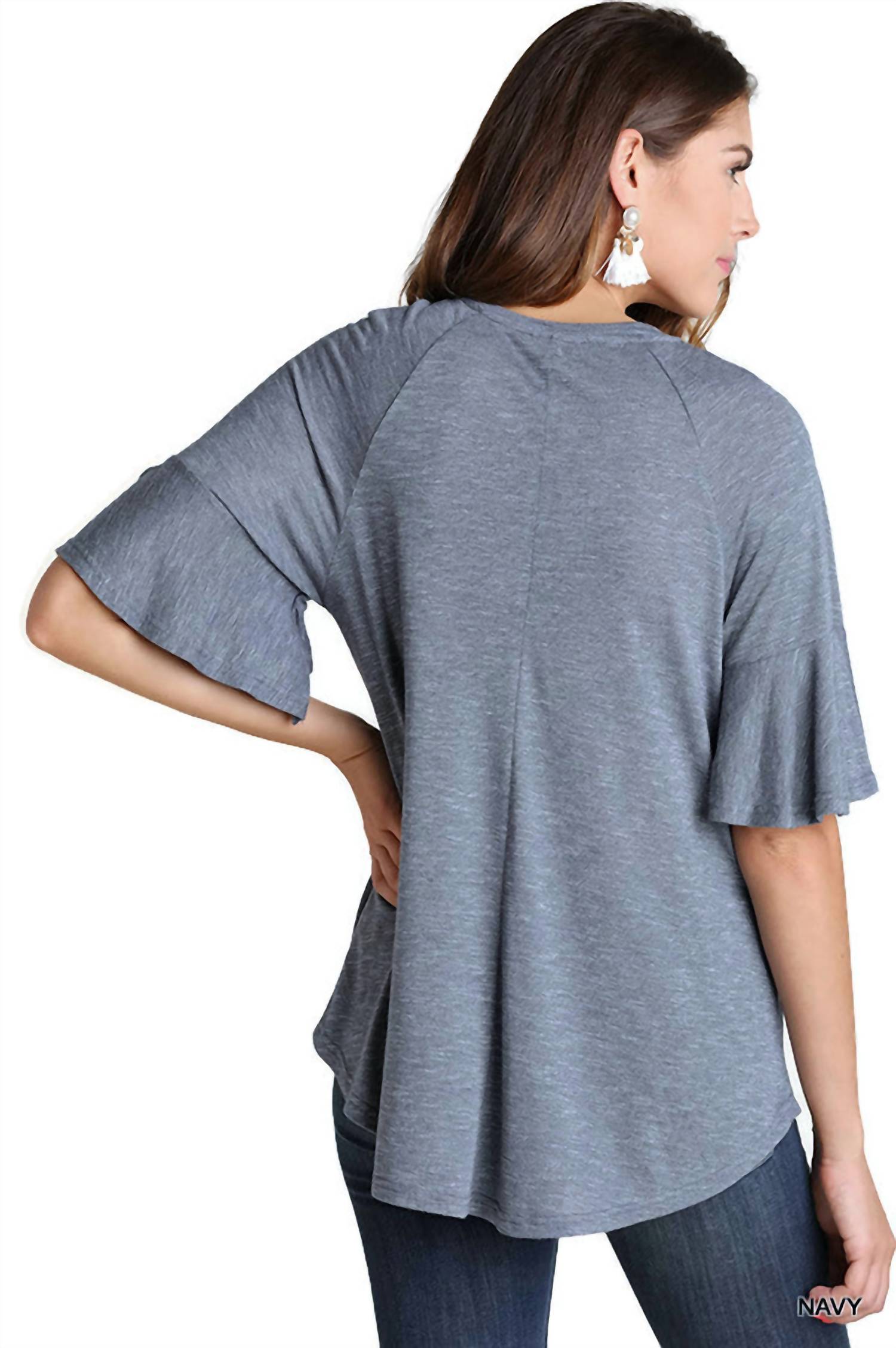 A versatile blouse that works from desk to dinner! Embrace a bohemian vibe with the Umgee Lace Up Bell Sleeve Top in elegant navy. This blouse showcases short mini bell sleeves, crafted from a soft poly/cotton blend with a playful high-low hemline. Closure: Tie Closure. Available in size specifications: Small Bust 38" L 26", Medium Bust 40" L 26.5", Large Bust 42" L 27". Ideal for a minimalist spring vacation wardrobe.