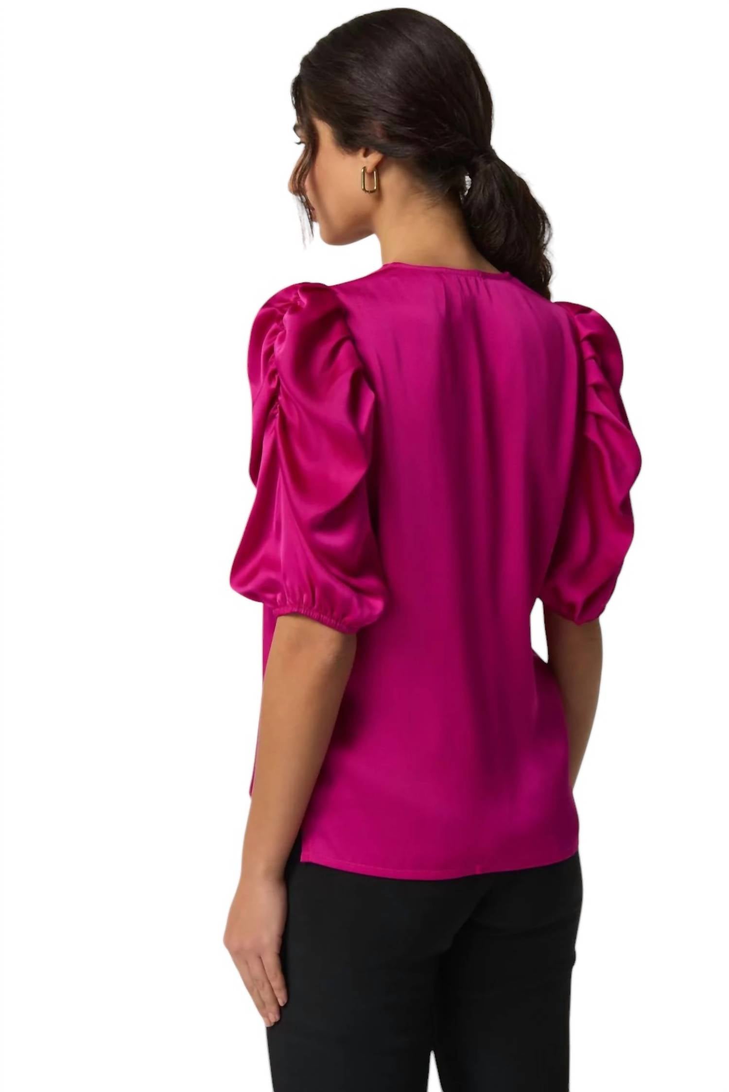 Elevate your wardrobe with the Puff Sleeve Satin Top by Joseph Ribkoff, designed in an opulent fall-inspired silky texture. This women's blouse features elbow sleeves and a plunging V-neckline, with contrasting puff sleeves that add a playful touch to your ensemble. Made from 100% polyester, this chic top is approximately 24 inches in length and proudly made in Canada. Enjoy the ease of a pull-on closure and effortless elegance with every wear. Hand wash cold to maintain its luxurious feel.