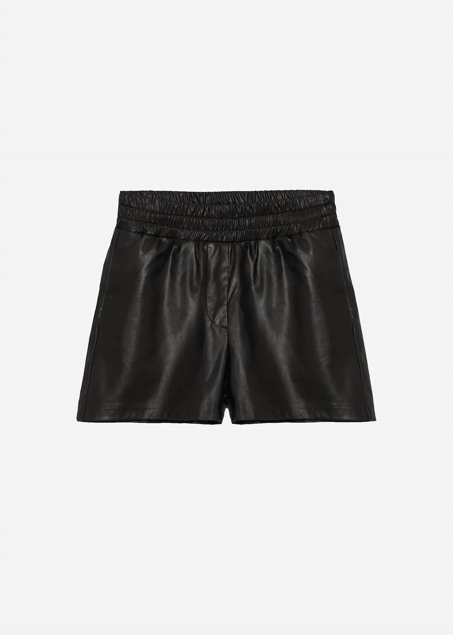Fit to perfection, we love these high-waist shorts and you will too. Discover the Blanchard Shorts by DELUC, crafted from 100% Polyurethane in a sleek vegan leather finish for a stylish, mid-rise fit. These relaxed-fit shorts feature a pull-on closure with an elastic waistband, making them both comfortable and chic. Designed with practical side pockets and an invisible hem, they seamlessly blend form and function. Enjoy the versatile elegance of these solid black shorts, a must-have addition to any wardrobe.