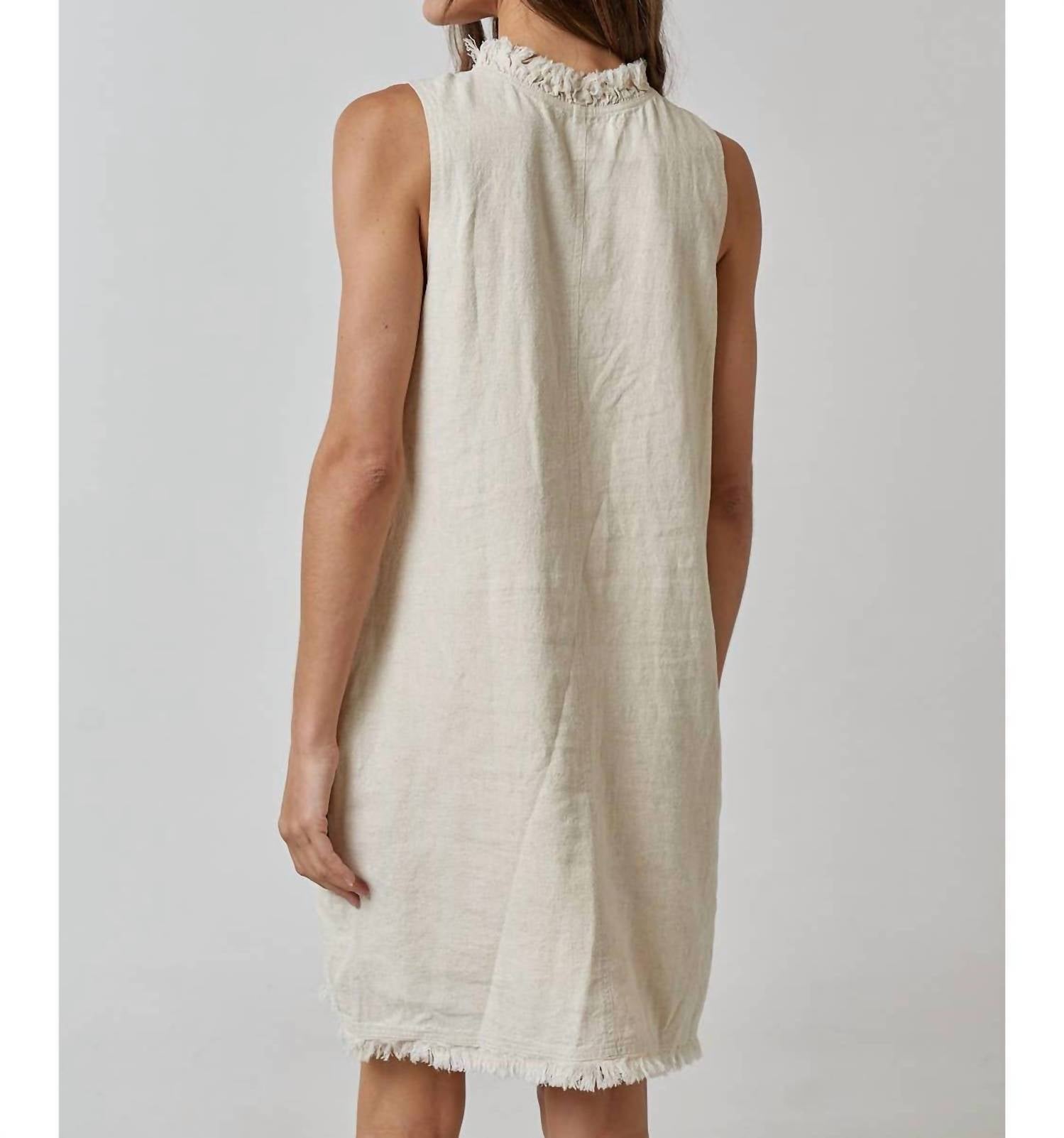 The perfect mini dress for those warmer months. Introducing the Frayed V-Neck Sleeveless Mini Dress by Lalavon, an essential for women seeking a touch of effortless charm in oatmeal. This mini dress, crafted from a soft cotton blend, features a relaxed silhouette with a raw-edge neckline and practical pockets. Designed with a solid pattern, it effortlessly pulls on for ease of wear. Hand wash recommended. 55%COTTON 45%LINEN.