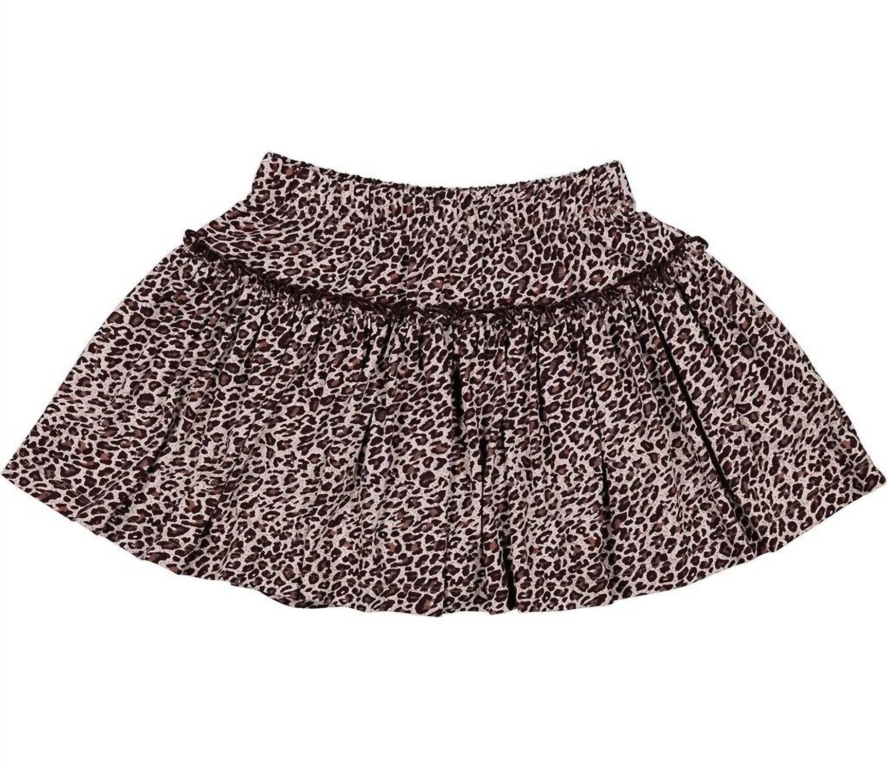 A customer favorite, and a perfect addition to your child's wardrobe. LOOK: Looks fabulous, with an elastic waist band and ruffled details that make it pop. Features a leopard print throughout the entire skirt. FABRIC: Fabric is soft, durable, and comfy. FIT: Skirt fits normal, goes slightly above the knees depending on height. STYLE/OCCASION: Can be worn in different occasions. Play dates, casual settings, and more. GARMENT CARE: Machine wash 40°C extra gentle - Wash with similar colours - Wash inside out - Do not bleach - Do not tumble dry - Warm iron - Do not dry clean. FABRIC CONTENT: 93% Viscose 7% Elasthane. Standard 100 by OEKO-TEX® certified. COLOR: Comes in Purple and Donkey color