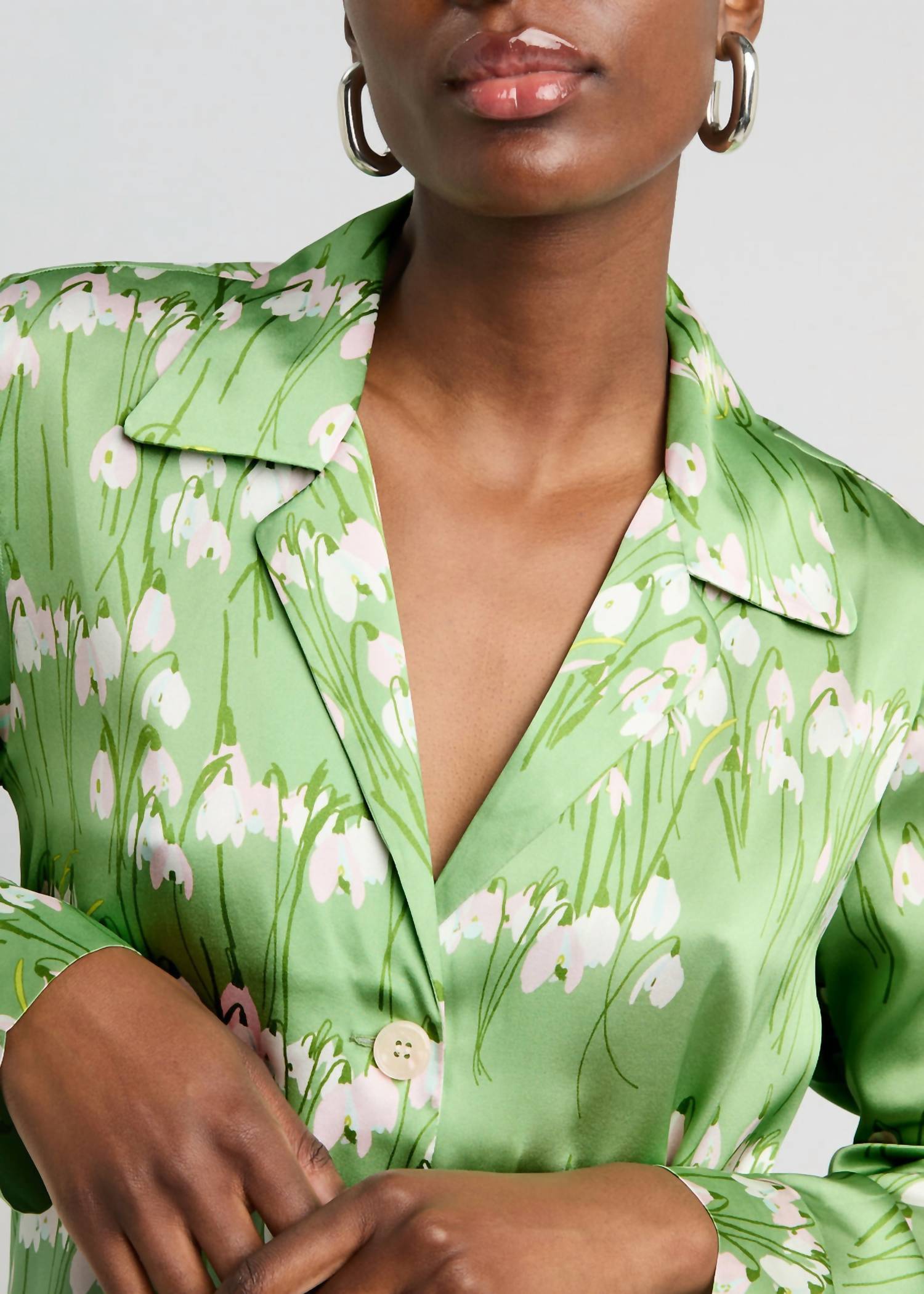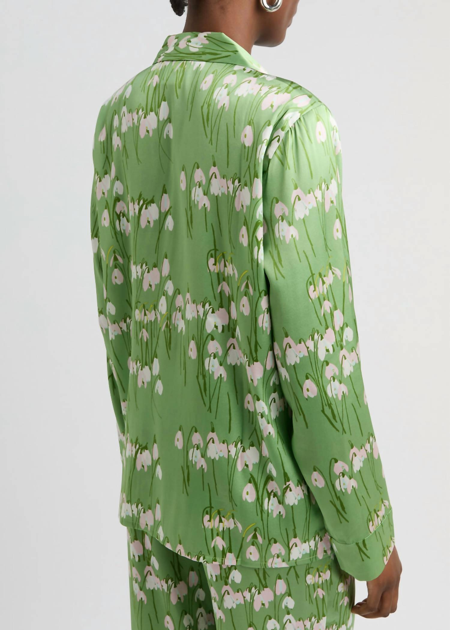 A classic button down shirt that will never go out of style. Embrace the effortless elegance of the Bernadette Louis Floral-print Pyjama Shirt, a striking piece in a lush green hue. Crafted from luxurious silk, this long-sleeve shirt features a captivating floral pattern that exudes sophistication and charm. With a classic collar neckline and convenient button closure, it ensures a streamlined silhouette perfect for any occasion. Care is simple with machine wash and line dry instructions.