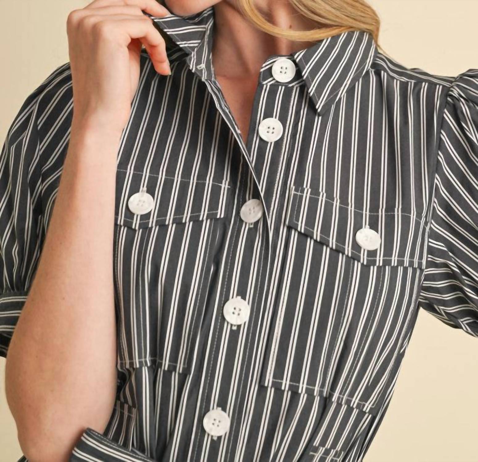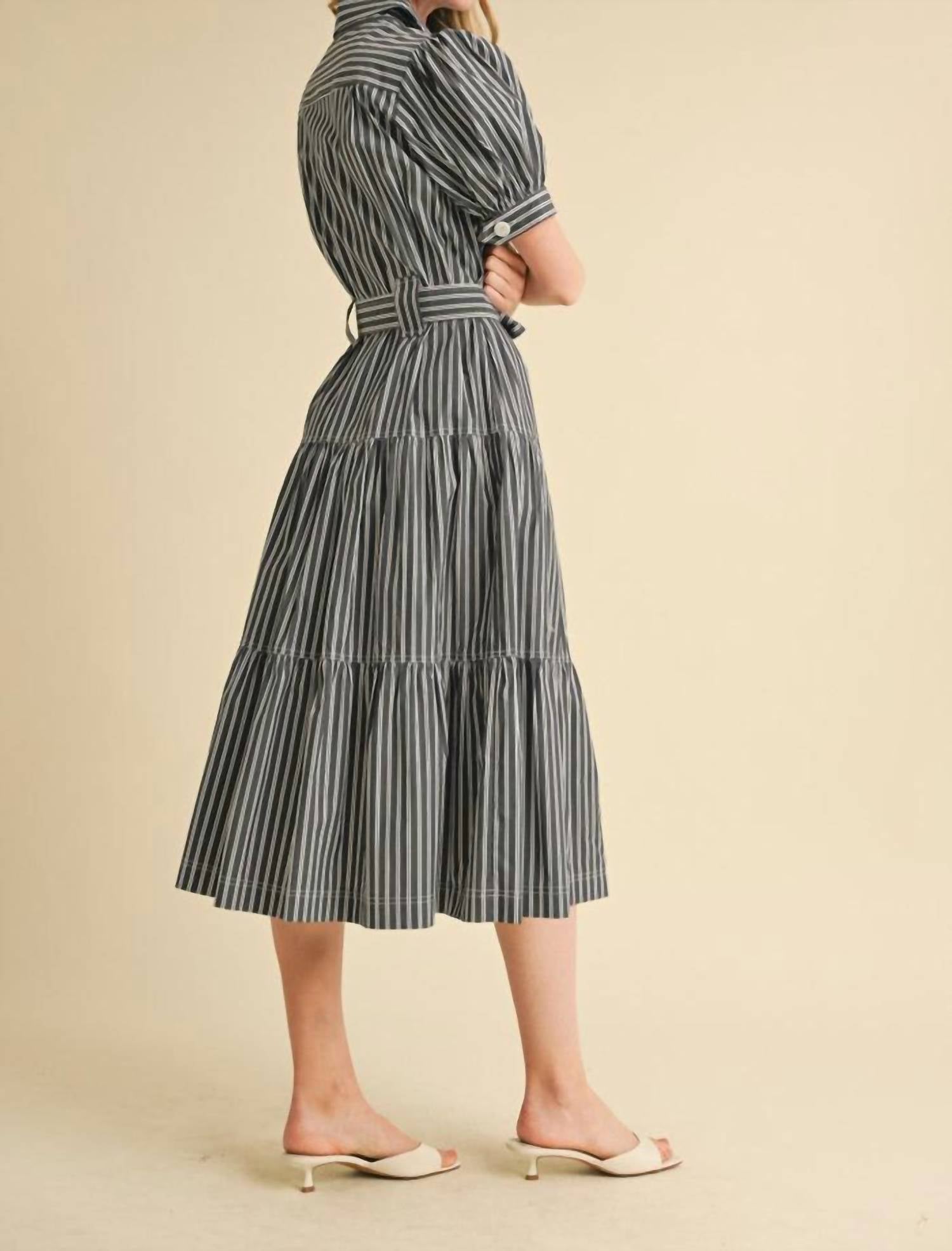 Just add slides or mules and you are good to go. Elevate your warm-weather wardrobe with the Debbie Dress by &Merci, featuring a chic black and white stripe design. This cotton shirt dress boasts short puff sleeves and a collared neckline, offering a timeless appeal. Its figure-hugging silhouette includes a functional button closure to the waist and comes with a tying sash and wide belt loops. The midi-length tiered skirt with pockets is ideal for pairing with boots or sandals. Machine wash. 100% Cotton.