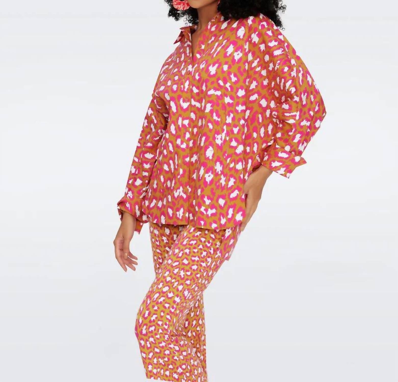 A timeless blouse that will never go out of style. Embrace the wild allure of the Diane von Furstenberg Women's Caleb Blouse in Natural Leopard print, an elegant addition to any wardrobe. This blouse features long sleeves and is crafted from soft cotton for a comfortable fit. It is designed with a stylish collar and practical pockets, ensuring both fashion and function. Closure: Button closure. Care: Machine wash and lay flat to dry.