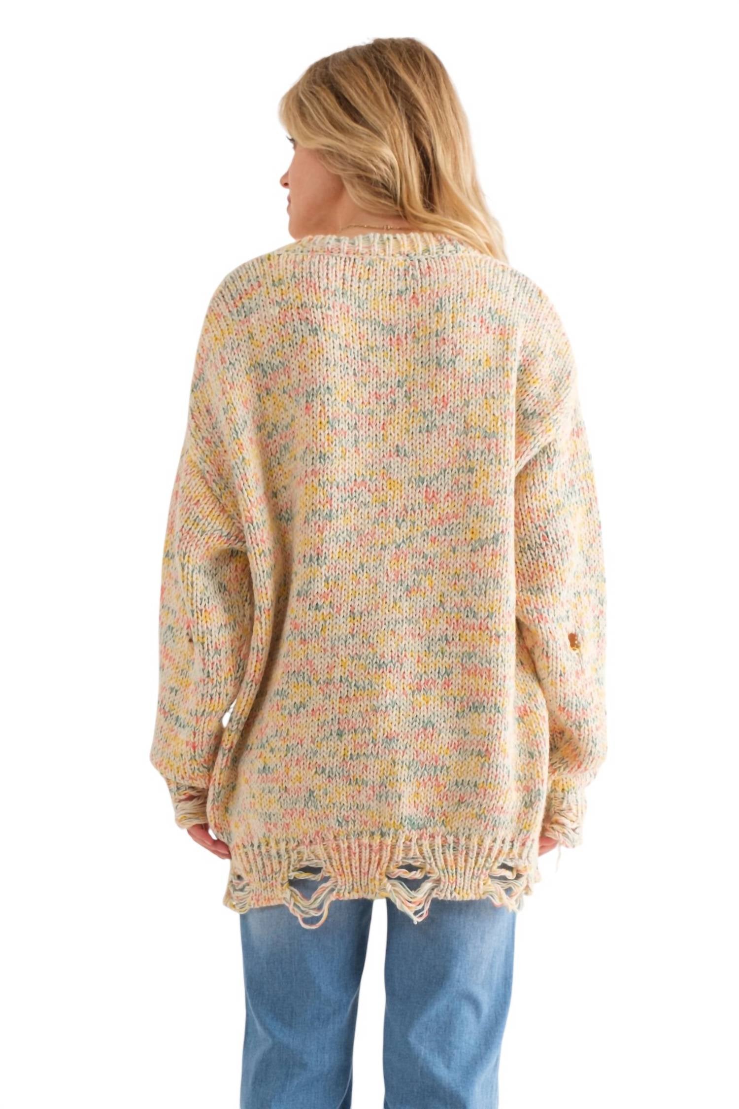 This distressed multi-color knit sweater features a round neck, long sleeves, and a destroyed hem, designed for a pull-on fit. Made from 100% polyester.