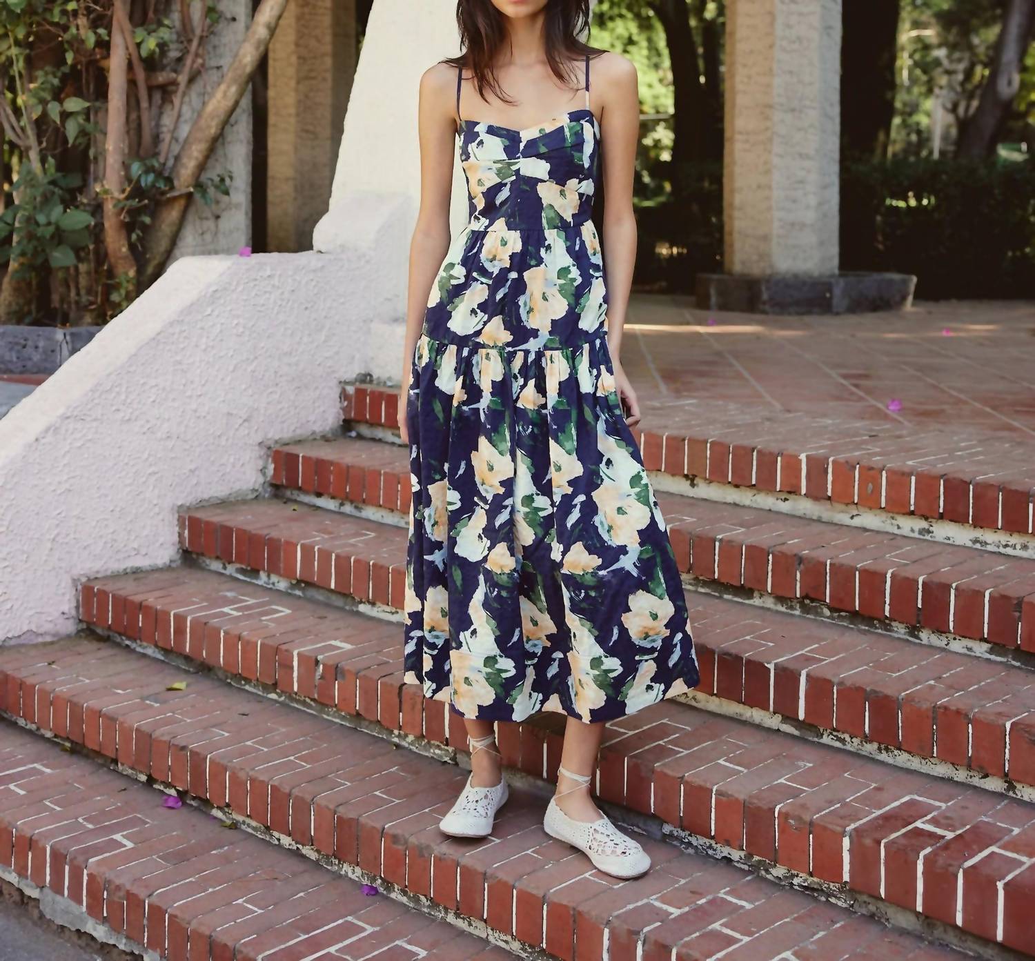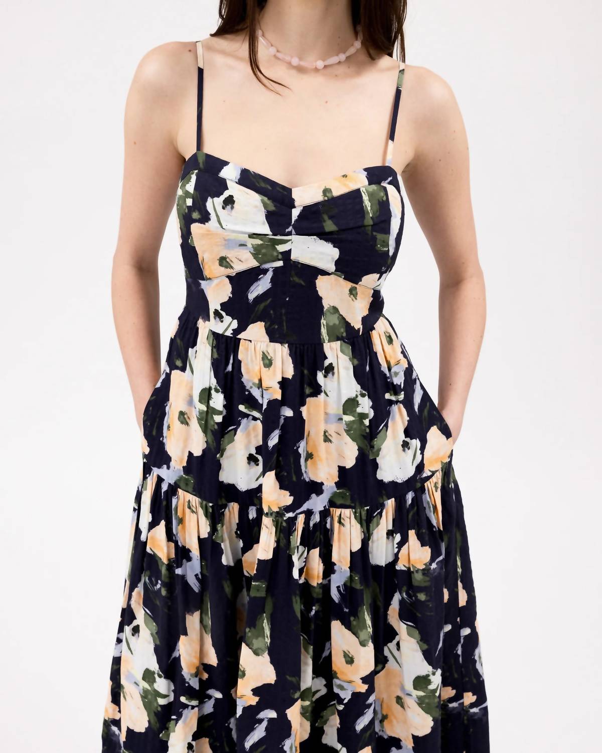 Just add slides or mules and you are good to go. Introducing the Verona Dress by TANYA TAYLOR, a chic choice for your day-to-night summer wardrobe in a captivating Painterly Abstract Floral print. This A-line midi dress features adjustable spaghetti straps, a flattering sweetheart neckline, and a tiered skirt for an effortlessly playful look. Crafted from a blend of 38% Viscose, 31% Rayon, and 31% Linen with a 100% Cotton lining, it ensures both comfort and style. Closure is a concealed center back zipper, and care is dry clean only. The dress measures 51 inches in length from the high point shoulder. Sophie, standing at 5'9", models a size 2.