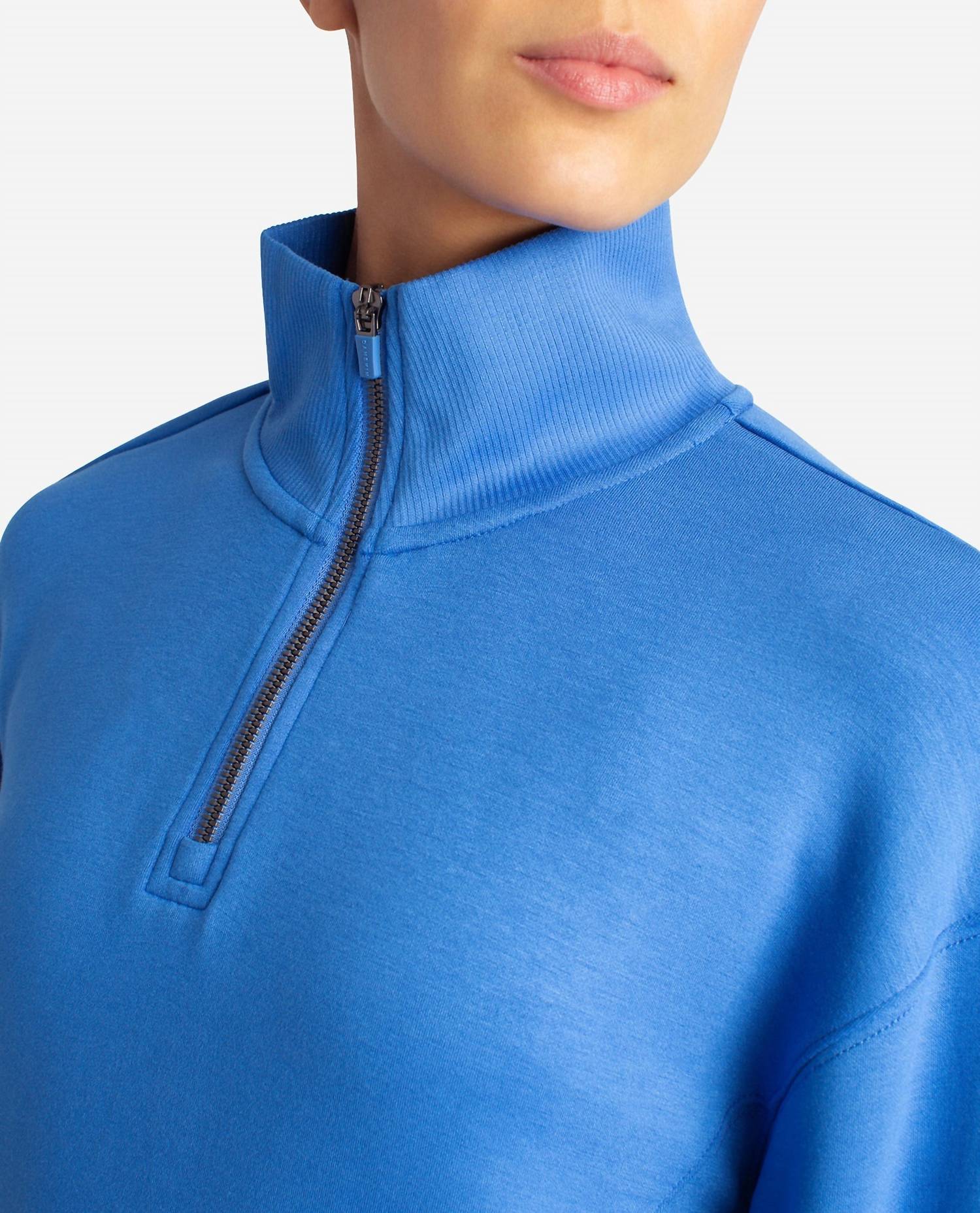 This long-sleeve utility jacket in palace blue boasts thumbholes and rib inserts. Crafted from 82% rayon, 13% polyester, and 5% spandex, it features a zip closure and a collar neckline. Ideal for active women who love a solid, sporty look without compromising on comfort.