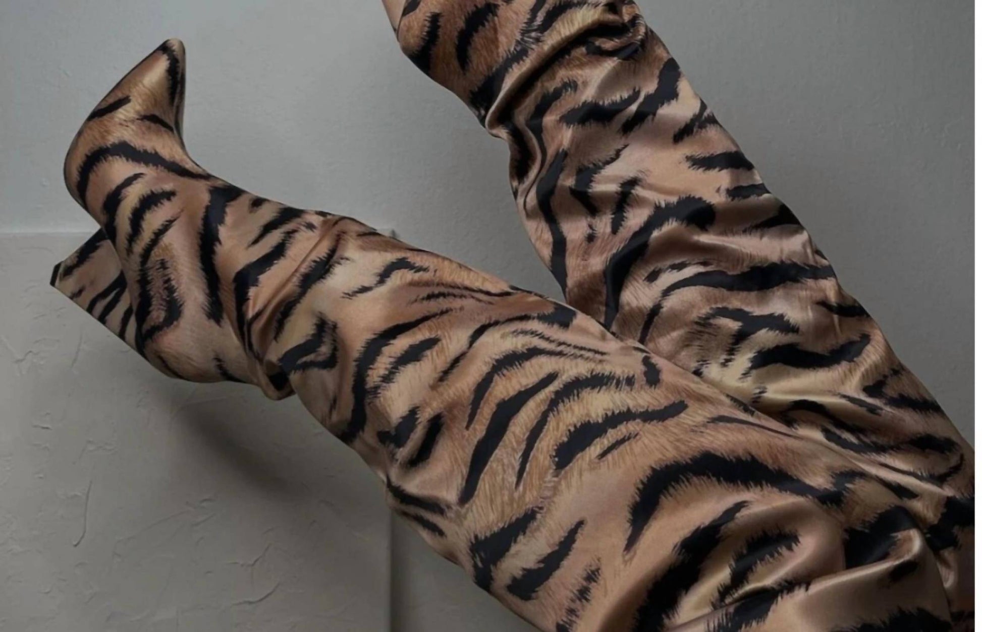 These over the knee boots are equal parts classic and cool. Elevate your fall wardrobe with the Women's Tiger Knee High Boots by SOTD FOOTWEAR, ideal for vacation styling. Crafted with a striking brown and black tiger pattern, these over-the-knee boots feature a pointed toe for a sleek silhouette. The distinctive cone heel provides both height and comfort. Perfect for women looking to make a bold statement this season.