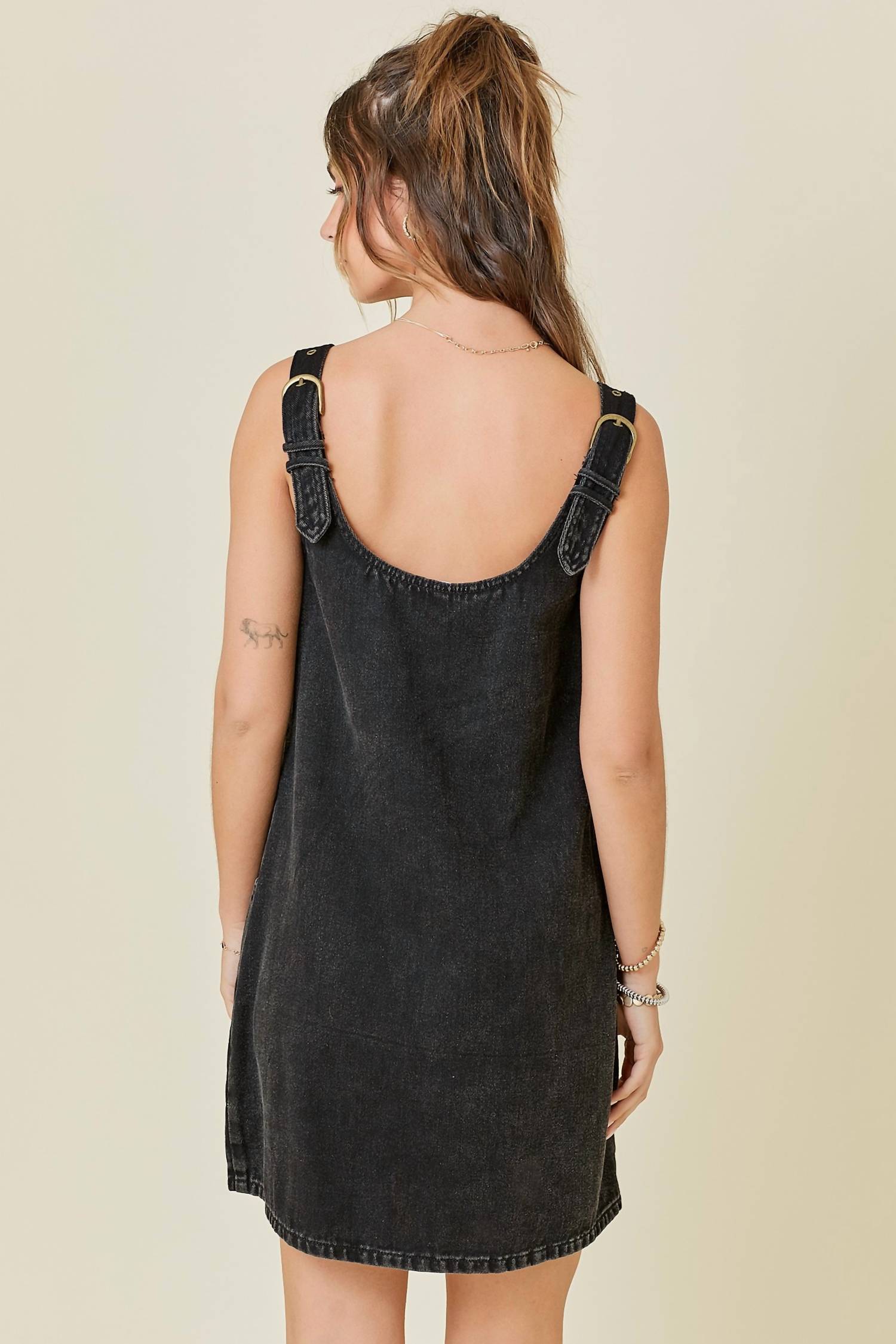 A short and breezy dress for those warmer days. Step into style with the Front Zip Denim Dress by day + moon, offering a chic and modern look in sleek black. This mini-length dress features a sleeveless design with adjustable straps adorned with gold hardware for a touch of elegance. Crafted from 85% cotton and 15% polyester washed denim fabric, it boasts two front pockets and a convenient front zip closure. Perfect for any occasion, it seamlessly merges comfort and trend with its classic square neckline.