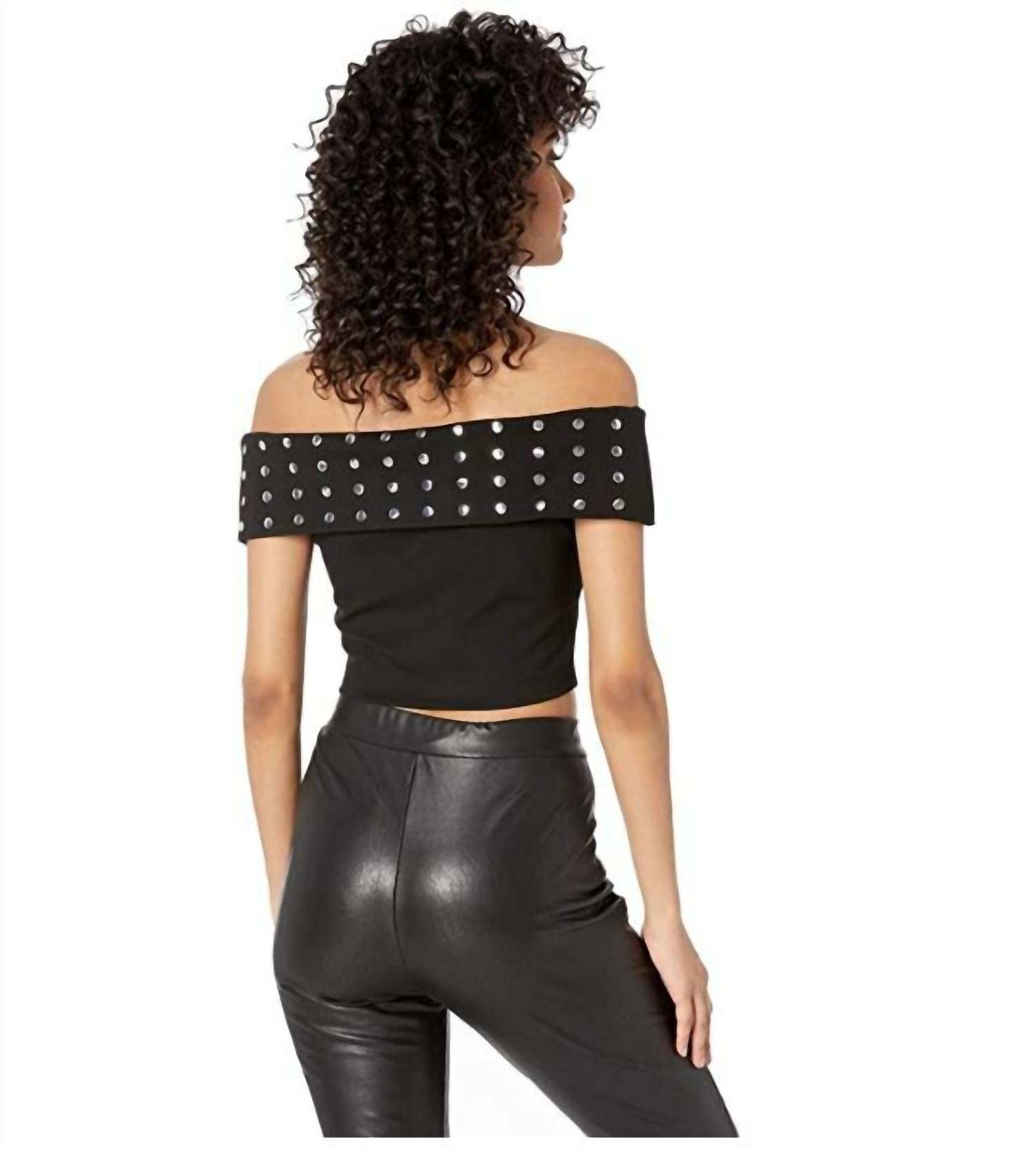 Introducing the Off the Shoulder Studded Crop Top by bebe, a perfect blend of edgy style and sleek design. With a cap sleeve and off-the-shoulder neckline accented with studded details, this top exudes modern glamour. Crafted from 62% rayon, 35% nylon, and 3% spandex, it ensures a comfortable fit while maintaining its cropped style with a 12.25" length and 17.5" chest measurement. The pull-on closure allows for easy wear, and it requires hand washing followed by laying flat to dry. Ideal for adding a touch of sophistication to any ensemble.