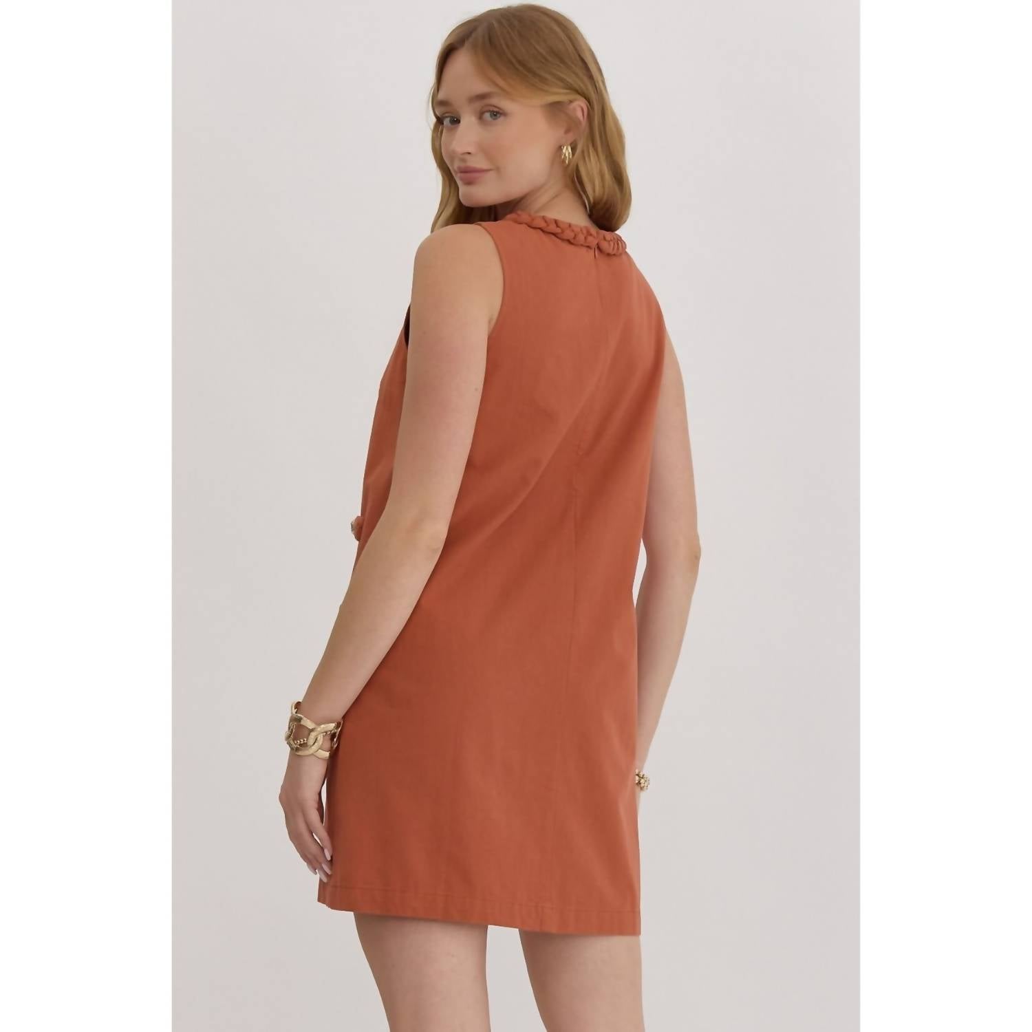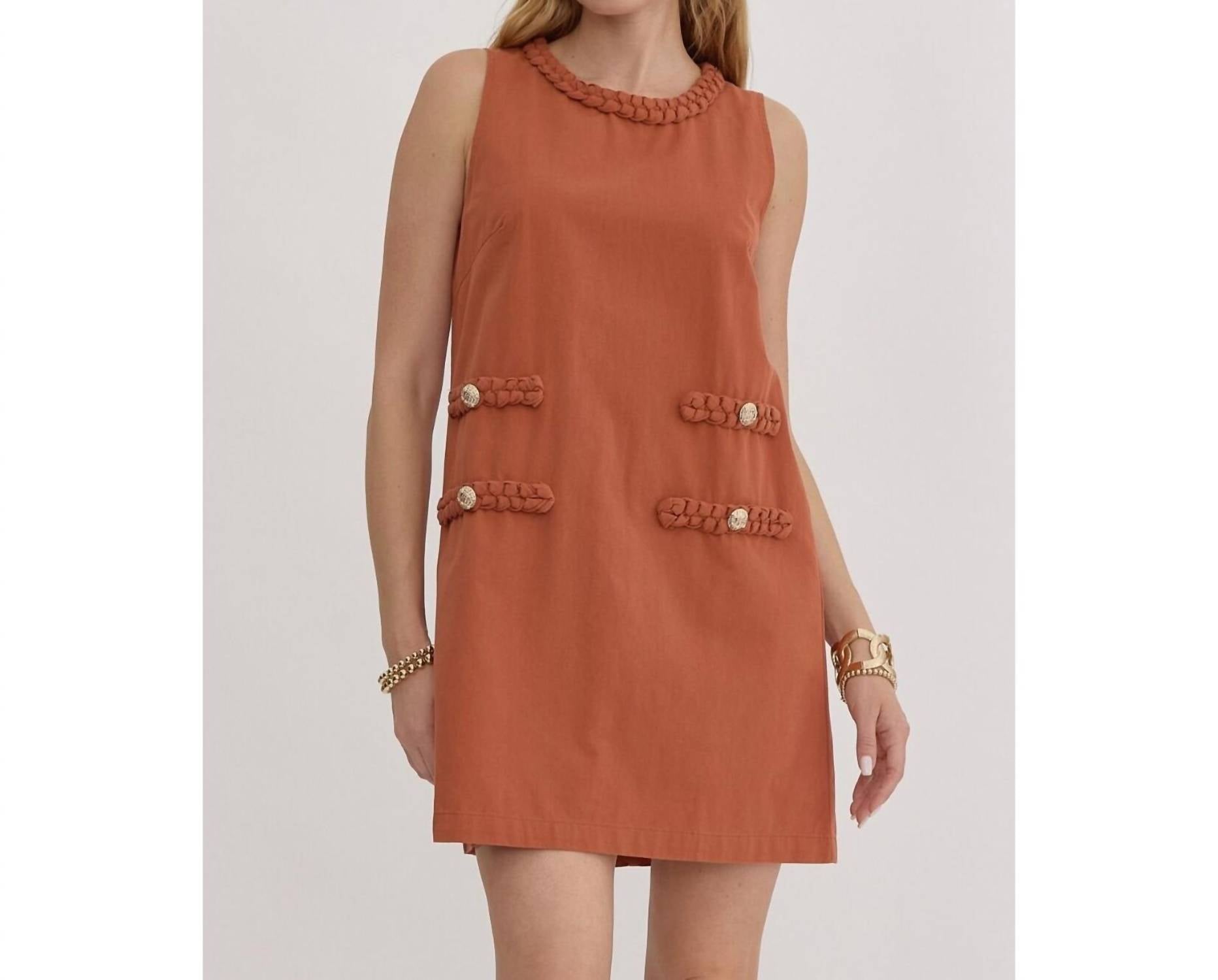 Comfortable and cute, this casual day dress has it all. Embrace chic minimalism with the Braided Trim Sheath Dress from Entro, a sophisticated rust-colored A-line dress perfect for any occasion. This sleeveless dress features a crewneck and eye-catching braided detail with gold button accents, adding a fun twist to your classic wardrobe. Designed for office wear, holidays, or nights out, it closes effortlessly with a zip closure and is made for women's wear. With a solid pattern, it is an ideal choice for the spring season, effortlessly blending style and elegance.