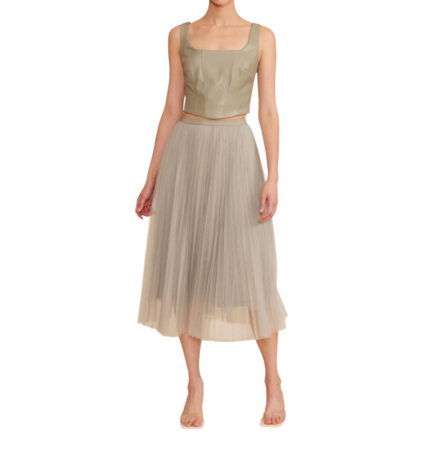 Tuck your favorite tee into this midi length skirt for an effortlessly cool look. Discover the Sharlene Pleated Tulle Skirt by Lucy Paris in a charming sage hue. With a 31.5-inch midi length, this skirt showcases a sophisticated pleated tulle overlay, ensuring a graceful silhouette. Made of 100% polyester, it's designed with a comfortable pull-on closure featuring an elastic waistband. Care for it effortlessly by spot cleaning and laying it flat to dry.
