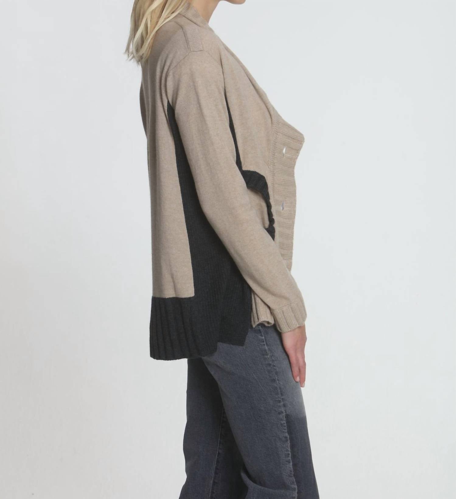 Throw this adorable cardigan over any cami or tank top. Elevate your winter wardrobe with the Willow Button Cardigan by LABEL+thread, available in a sophisticated Barley/Charcoal colorway. This long-sleeve cardigan showcases a luxurious composition of 70% Wool and 30% Cashmere, offering both warmth and comfort in a lightweight form. The cardigan features high slits, chunky rib trims, and a contrast color banded rib along the back for a chic 90s fashion vibe. Closure is achieved with traditional coat buttons, while a cowling collar and V-neckline add a relaxed, casual elegance. Care instructions recommend hand washing or dry cleaning.