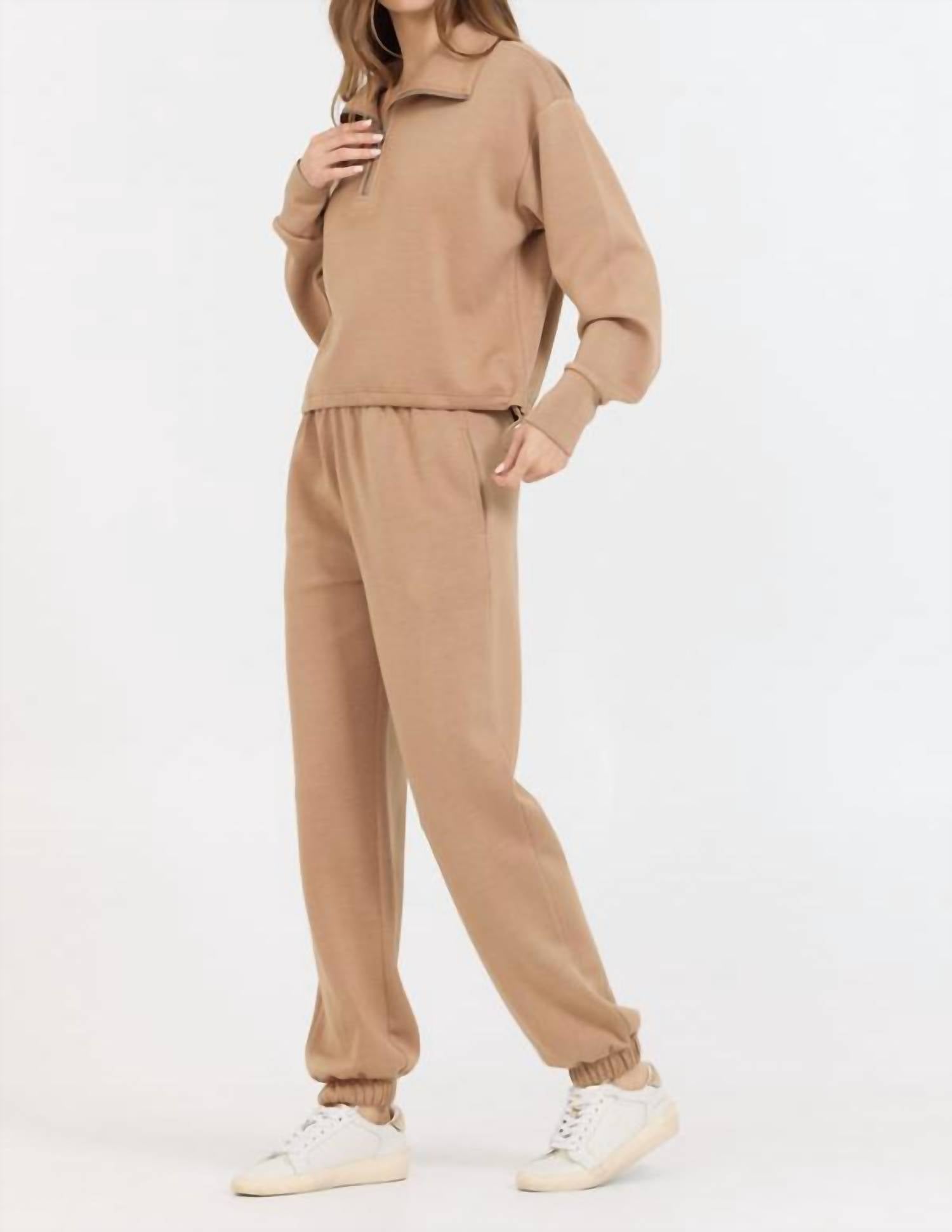 Loungewear doesn't have to be frumpy and this is exactly what we had in mind. Designed for a comfortable fit, this chic little number will be your favorite lounging-at-home look. The Cloud Set by Vintage Havana is a luxurious caramel-colored loungewear set designed for ultimate comfort and style. Featuring a long sleeve quarter zip top with a crewneck collar, it is crafted from cloud soft material, offering unparalleled coziness. Ideal for lounging or errands, this set makes you feel effortlessly cool and stylish. Perfect for those who appreciate comfort without compromising on fashion.