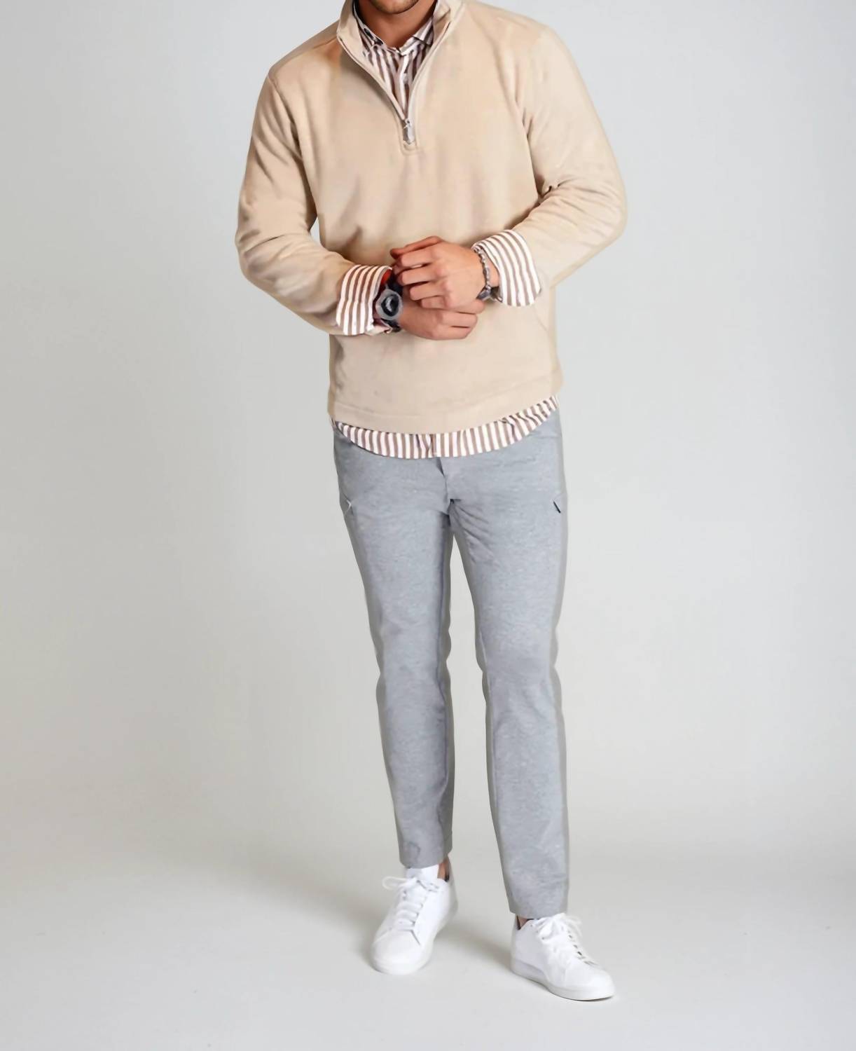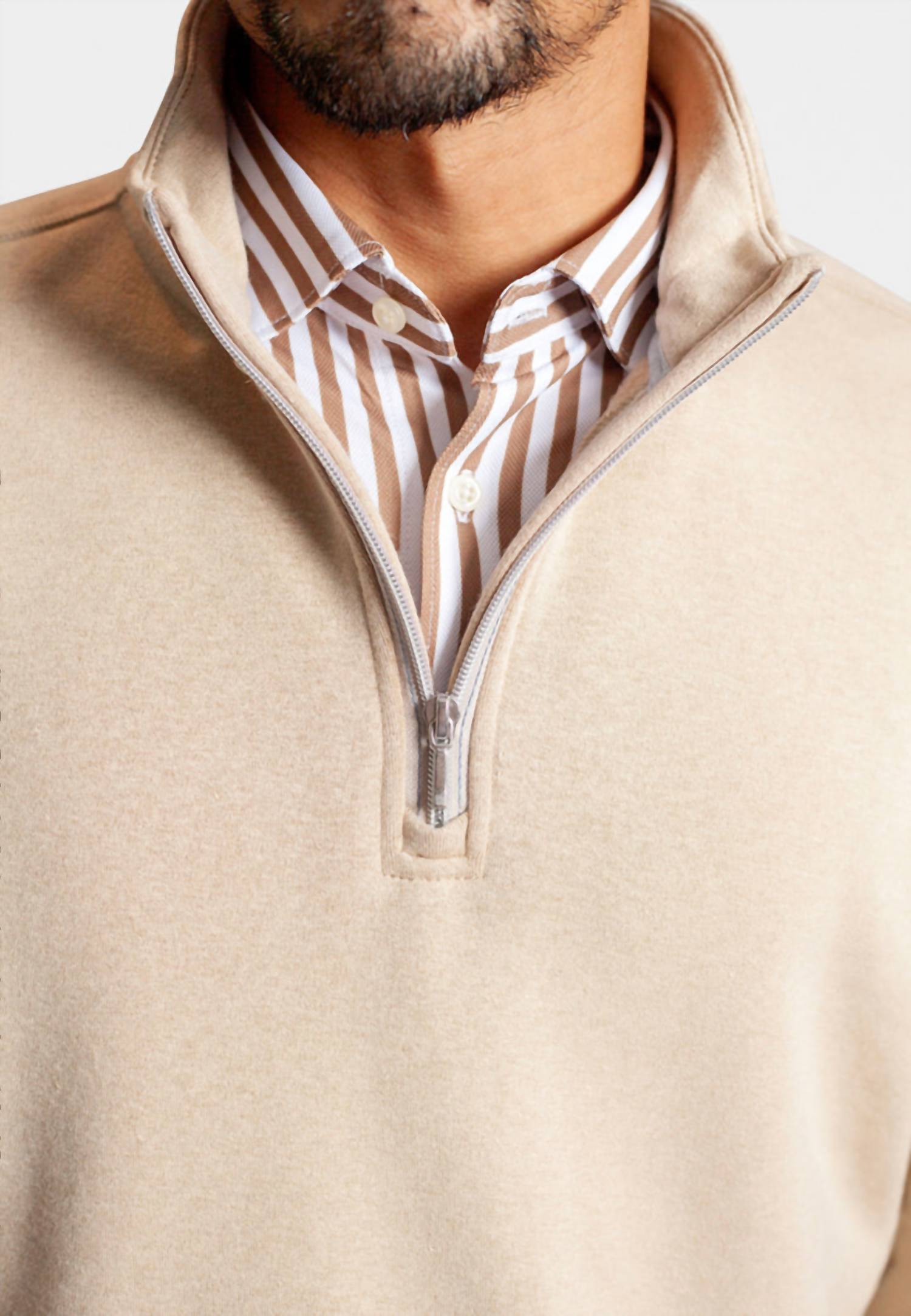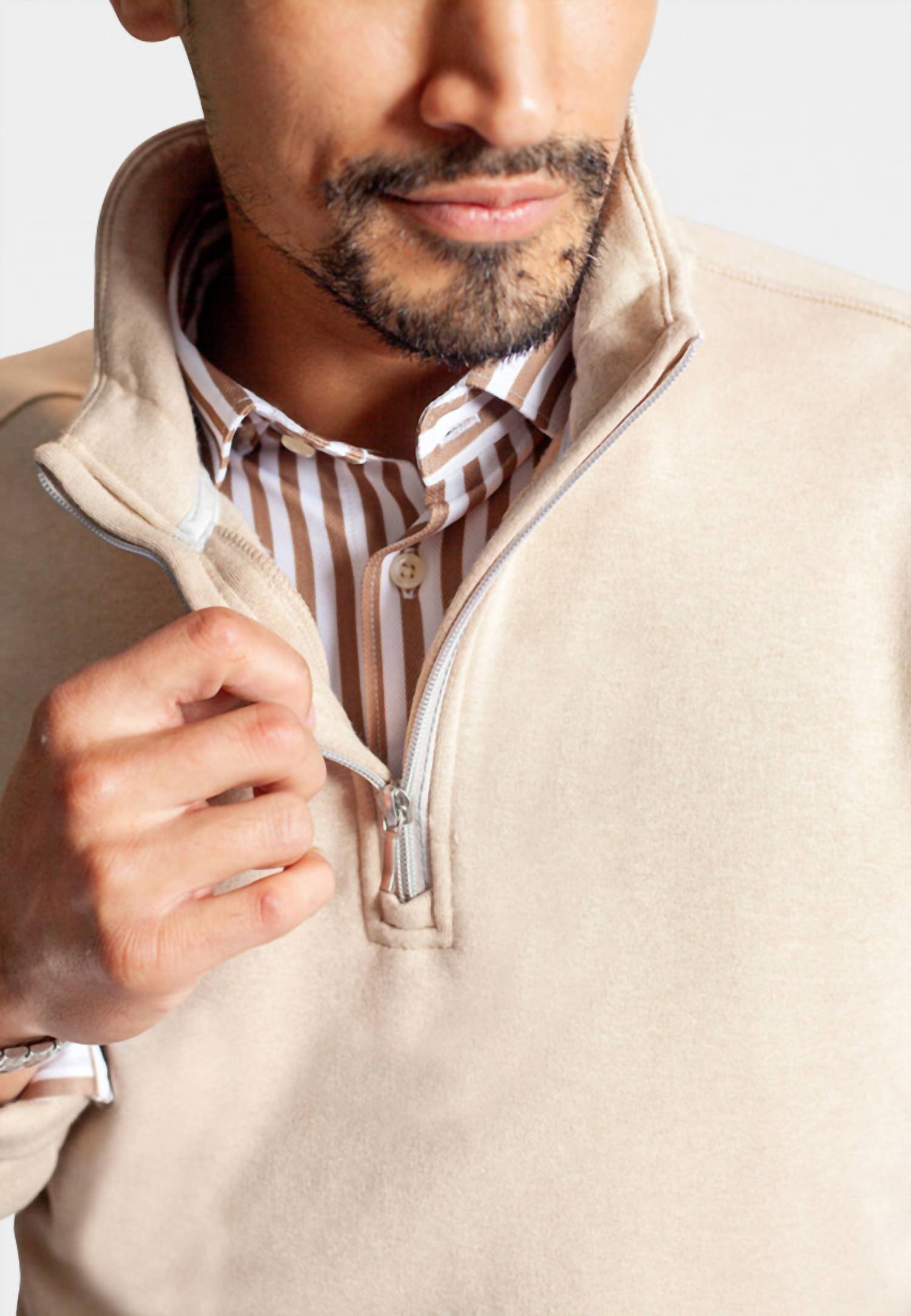 Introducing the Voey Quarter Zip Sweatshirt by Buki, a luxurious camel-toned piece perfect for both casual and polished looks. This long-sleeve sweatshirt is crafted from ultra-soft, thermo-regulating Buki Luxe fabric, ensuring optimal comfort and seamless layering for any occasion. With its convenient zip closure and mockneck design, this sweatshirt stands out as a versatile choice for travel and everyday wear. Elevate your fall wardrobe with this wrinkle-resistant essential, designed without harmful chemicals, enhancing both style and practicality.